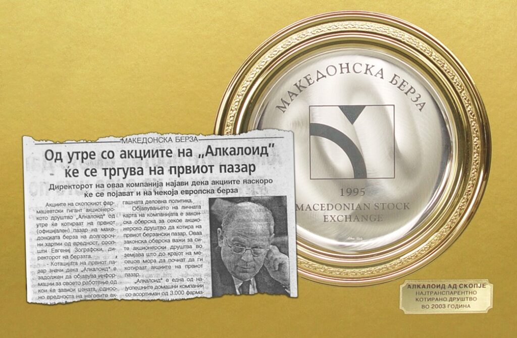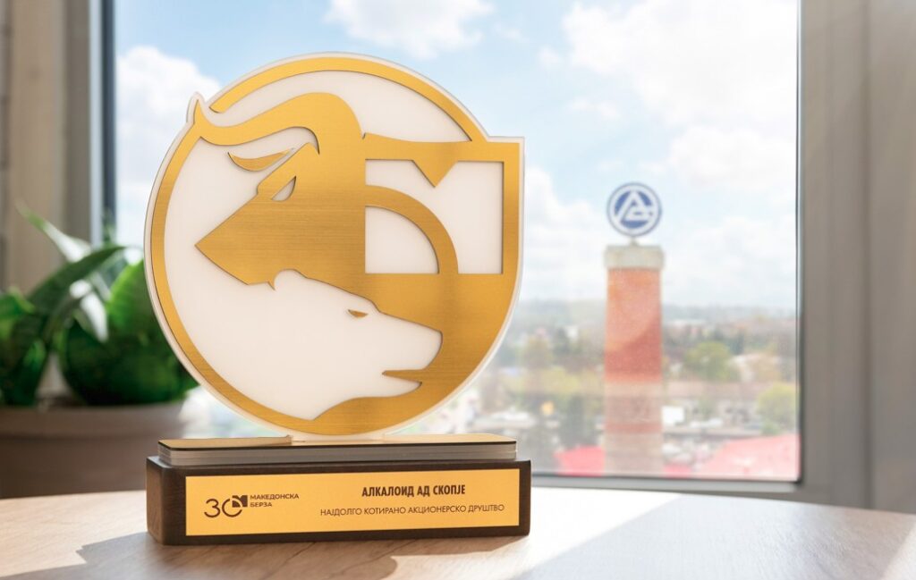 На јубилејната церемонија им беа врачени пригодни признанија на неколку субјекти поврзани со работењето на Берзата, меѓу кои и „Алкалоид“. Плакетата за најдолго котирано акционерско друштво во име на компанијата ја прими генералниот директор и претседател на УО на „Алкалоид“, Живко Мукаетов.