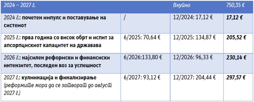 Ако на 2024 година се гледаше како на година за политичка и за административна подготовка, вистинскиот политички, административен и финансискиот притисок се концентрира во периодот 2025 − 2027 година. Институциите кумулираа доцнење со изградба на капацитетите уште во 2024 година кога се случија парламентарни избори и реорганизација на институциите и на дел од нивните надлежности, а потоа и во 2025 година со локалните избори кои апсорбираа голем дел од политичката енергија неопходна за донесување одлуки. Тогаш и ризикот од доцнење со реформите и потенцијалните загубени средства се зголемија експоненцијално. Денеска сме веќе навлезени во 2026 година (март), а сите реформи, односно сите чекори мора да се затворат најдоцна до август следнава година како последен рок за доставување на Барање за повлекување на последната полугодишна транша од средствата. Според расположливите јавни податоци, засега степенот на реализација се смета дека е под 35 % само за периодот 2024 − 2025 година, додека интензитетот на реформите за периодот 2026 − 2027 година е двојно поголем, што предизвикува сериозна загриженост за можноста средствата да се искористат и како инфузија за нашиот буџет, а уште помалку како капитални инвестиции со реализација на зрели проекти.