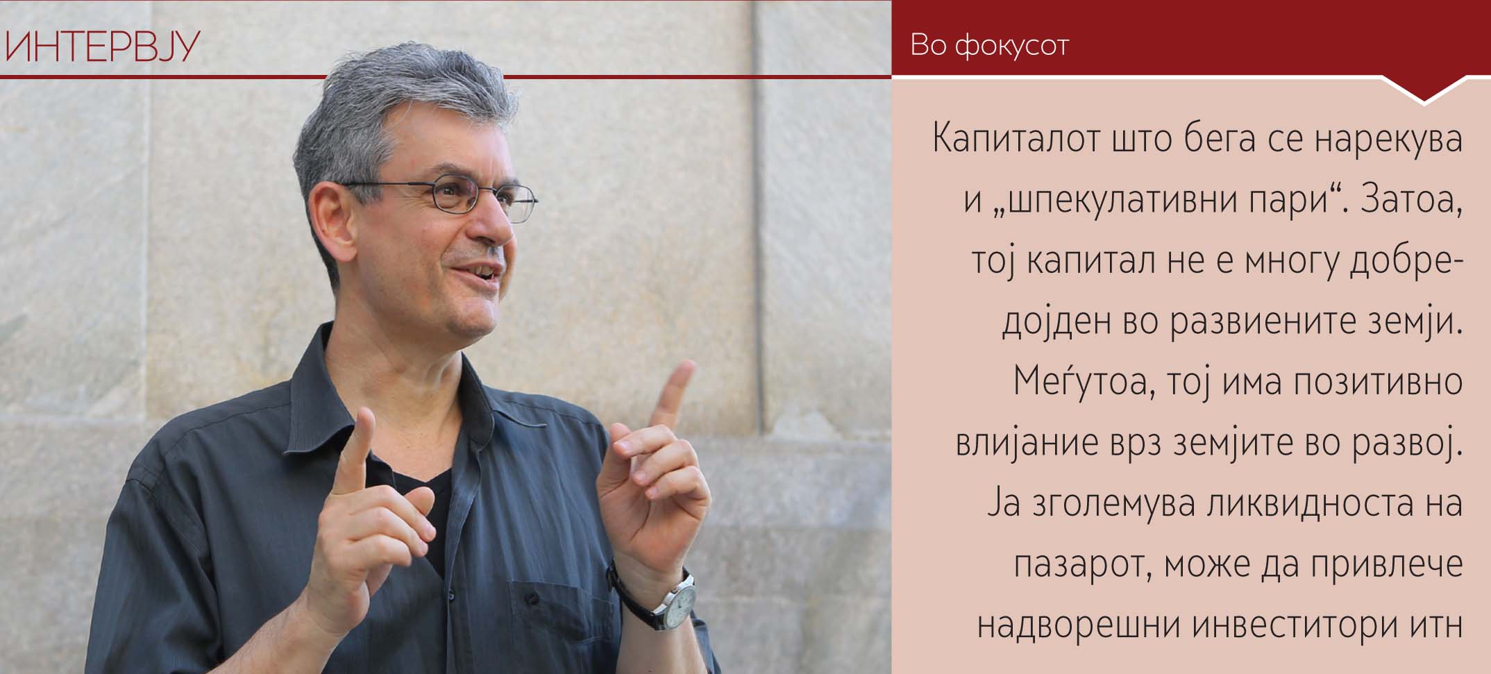 Разговорот со Сем Вакнин е секогаш интересен. Уште пред три години на страниците на „Економија и бизнис“ го прогнозираше забавувањето на кинеската економија и падот на вредноста на кинеските акции. Во оваа прилика разговараме за достасаните неизмирени обврски, за неплаќањето и за банкротот, како различни термини и ситуации кои често погрешно се користат. Разговараме и за тоа како да се привлече во Македонија капиталот што бега од земјите во регионот. Конечно, Вакнин објаснува што би значело од економски аспект, чисто хипотетички, евентуалното излегување од еврозоната на земја како Грција.