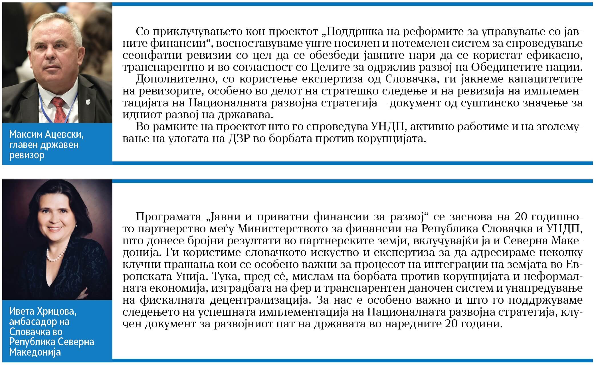 Проектот се спроведува во рамките на програмата „Јавни и приватни финансии за развој“ и имплементира решенија кои придонесуваат за модернизација, за ефикасност, за транспарентност и за усогласување на системот за јавни финансии со стандардите на ЕУ. Оваа програма се заснова на речиси 20-годишно партнерство меѓу Министерството за финансии на Република Словачка и УНДП, што донесе бројни резултати во партнерските земји, вклучувајќи ја и Северна Македонија.