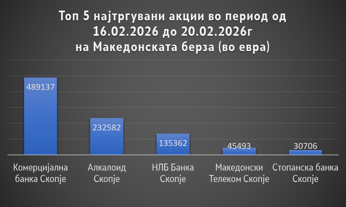Минатата недела, во периодот од 16.02.2026 – 20.02.2026 година на Македонската берза на хартии од вредност на официјалниот и на редовниот пазар беше остварен вкупен промет од 64 милиони денари или околу 1,04 милиони евра. Ова претставува намалување од 51,6 % отсто во однос на претходната недела.