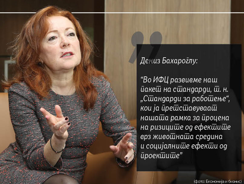 Дениз Бахароглу: Кај нас секој клиент и секој проект претставуваат посебна студија на случај во која ИФЦ врши позитивно влијание врз унапредувањето на овие стандарди во приватниот сектор. Како најголем инвеститор во приватниот сектор кај земјите во развој ИФЦ се соочува со многу ситуации во кои примената на здрави стандарди за управување, за животна средина и за социјални прашања претставува неопходен услов за партнерство со локалните организации. Во ИФЦ развивме наш пакет на стандарди, т. н. „Стандарди за работење“, кои ја претставуваат нашата рамка за процена на ризиците од ефектите врз животната средина и социјалните ефекти од проектите и предвидуваат мерки за ублажување на овие ризици. Од 2006 година стандардите за работењето се прифаќаат во меѓународни рамки и моментално се применуваат кај повеќе од 80 финансиски институции и комерцијални банки.