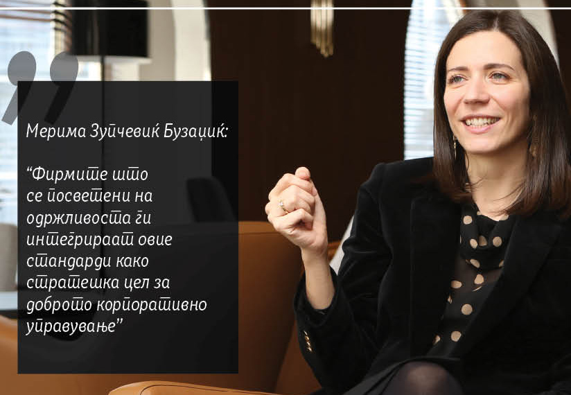 Мерима Зупчевиќ Бузаџиќ: Овие стандарди ги водат организациите од јавниот и од приватниот сектор за да го унапредат своето управување преку донесување подобри одлуки, зголемување на нивната оперативна ефикасност, подобро вреднување и управување со ризиците и влијанијата, и тоа како со репутациските, така и со влијанијата врз животната средина и социјалните ризици. Тие им помагаат да се привлечат и да се задржат инвестициите намалувајќи ја цената на чинење на капиталот и доведувајќи до унапредување на условите за кредитирање, зголемувајќи ја оперативната ефикасност и унапредувајќи го пристапот до финансирање. Приватните и јавните организации и граѓаните во земјите во развој сѐ повеќе настојуваат да се интегрираат во глобалната економија и да привлечат капитал за раст и развој на локалниот бизнис, да креираат работни места и да ја подобрат инфраструктурата за сите граѓани. Меѓутоа, овие стандарди честопати може да се гледаат како бариера. Сепак, организациите што ќе ги вградат овие аспекти во своите деловни модели добиваат поврат на инвестицијата со тоа што уживаат во пониските трошоци за домашниот и за странскиот капитал и во позитивно влијание врз ефикасноста на деловните процеси што доведува до долгорочни заштеди. Фирмите што се посветени на одржливоста ги интегрираат овие стандарди како стратешка цел за доброто корпоративно управување заедно со одборот на директори кој е разнолик и полн со знаења, кој гледа нанапред и стратешки се фокусира притоа надледувајќи ги управувањето со ризиците и работата на високото раководство и помагајќи му да се идентификуваат и да се третираат аспектите на животната средина и социјалните аспекти.