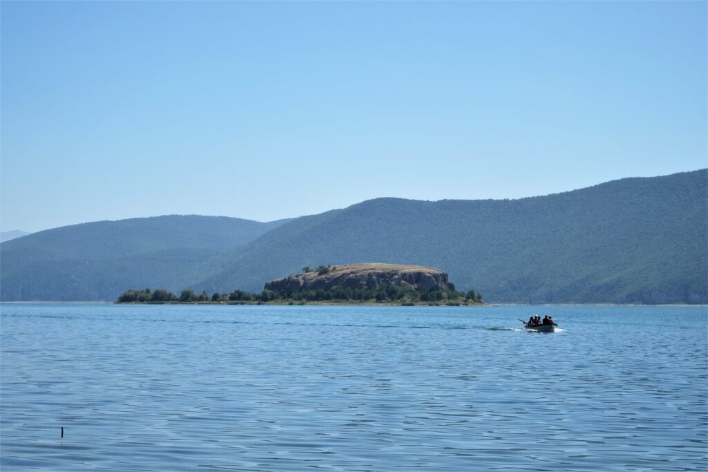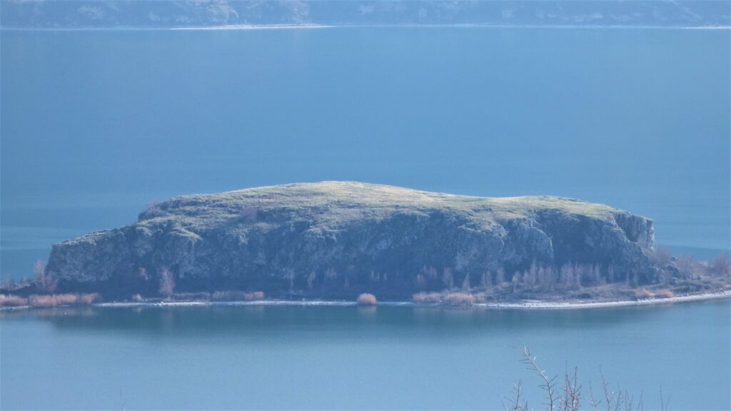 На само десетина метри пред црквата на островот, од лева страна се наоѓаат интересни цртежи на карпа. Водичот од Пустец на убав македонски дијалект веднаш потенцира дека „Ова ести најстарата фреска на островот“. Според новопоставената табла станува збор за една од најстарите и уникатни христијански иконографии во регионот. Најстарите населби датираат уште од неолитот. На брегот на островот, на местото каде што застануваат чамците, имаше керамички предмети во кружна форма со отвори на средината. Слични се изложени и во Археолошкиот музеј во Корча и се датирани од праисторијата. Дел од претпоставките се дека имале функција на тегови на рибарските мрежи. Црквата посветена на Рождеството на Пресвета Богородица датира од XIV век. На црквата добро сочувани се ликовите на благодорникот Кесар Новак и неговата сопруга Калија. Локацијата е исклучително убава и мистична. Црквата е изградена во пештера, природно обезбедена од неповолни атмосферски влијанија во мистичен амбиент. Се чини дека е идеална за монашки живот. Последниве години на дрвената платформа пред црквата се организираат и концерти на класична музика.
