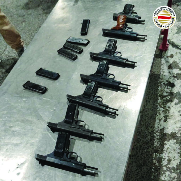 Вработени во Царинската управа спречија обид за сериозен меѓународен криминал, при што запленети се девет пиштоли од кои пет со голема пробивна моќ, а едно лице, македонски државјанин, е лишено