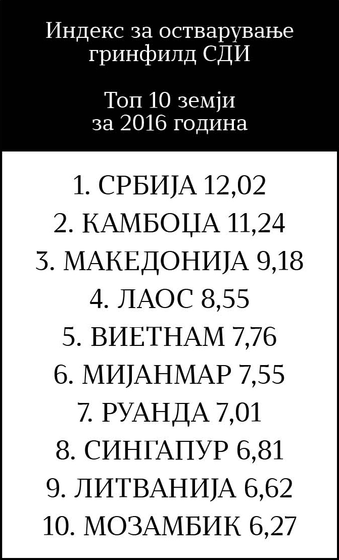 Оваа вест, објавена во март 2017 година, не е забележена во српските медиуми, но ФДИ интелиџенс е извор што често и со задоволство се цитира во Србија. Така, во 2014 година управата на Врање објави дека Врање е еден од 10 градови со најповолни услови за работење во категоријата европски градови со иста големина. Поточно кажано, во конкуренција на 468 градови и региони Врање го зазеде седмото место, а од српските градови Заечар беше шести, додека по Врање беа Зрењанин, Сремска Митровица и Рума. Во 2015 година ФДИ ја прогласи слободната зона во Зрењанин за најдобра во Европа според поттикнувачите за инвеститори, а во 2016 година, според истиот извор, Србија го зголеми нивото на странски директни инвестиции (СДИ) за 90 % бидејќи една арапска фирма соопшти дека во „Белград на вода“ ќе вложи 4 милијарди евра. Во август годинава, според индексот на ФДИ за остварување гринфилд СДИ, Србија била најуспешна земја на светот по обемот на привлечени гринфилд инвестиции во однос на својот БДП. Втора била Камбоџа, трета Македонија, а потоа следуваат низа земји што припаѓаат на групата неразвиени земји во развој, со исклучок на две земји, Сингапур и Литванија. Со оглед на тоа што минатата година е вклучен поголем број земји (вкупно 94), Србија го замени на тронот Виетнам кој беше на првото место во претходните две години.