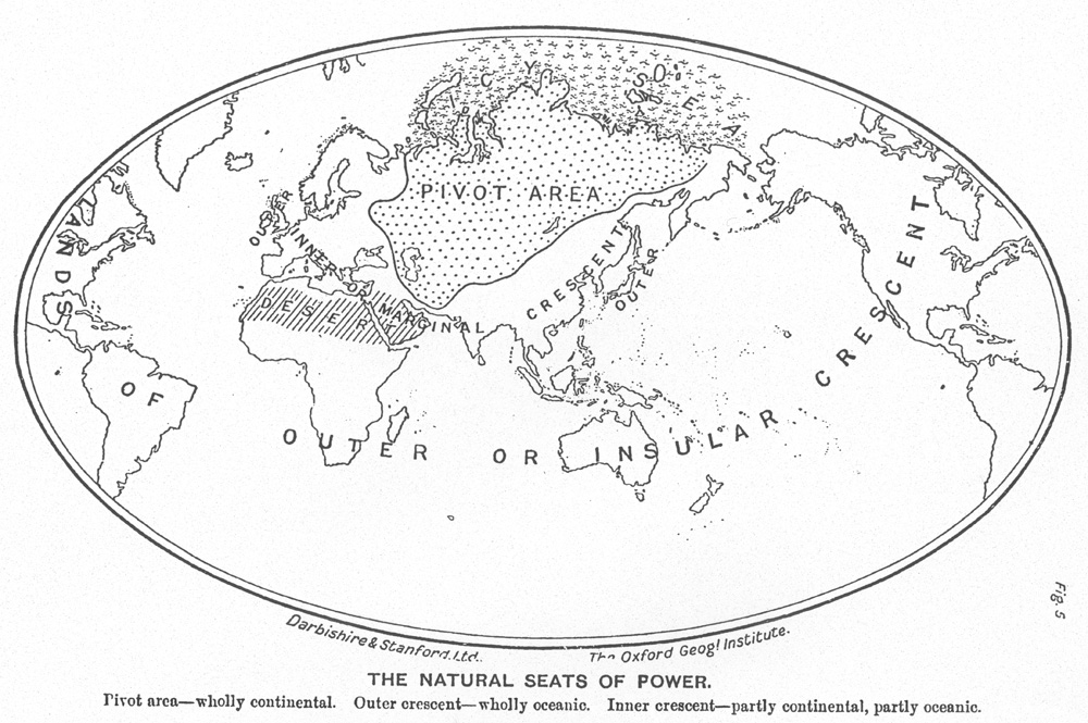 Халфорд Макиндер е истакнат научник - географ чие капитално дело издадено во 1904 година, „Географскиот стожер на историјата“, во кое ја објаснува неговата Теорија за Срцевијата (Heartland Theory), претставува една од основите за прифаќањето на географијата како носечки фактор во анализата, во експликацијата и во предвидувањето на политичките движења или геополитиката. Според Мекиндер, во геополитичка смисла, светот е поделен на неколку региони. Првиот, и според Мекиндер, најголемиот и најважниот регион е наречен „Светските Острови“ во кој спаѓаат трите континенти Европа, Азија и Африка. Натаму е вториот регион наречен „Островите покрај брегот“ каде што спаѓаат географските островите околу, вклучувајќи ги Велика Британија и Јапонија. На крајот е третиот регион наречен „Оддалечени Острови“ каде што спаѓаат Северна и Јужна Америка, Австралија и Океанија итн. Поради разни фактори како што се концентрација на население, расположливост на ресурси, географски граници итн., во својата теорија Мекиндер заклучува дека контролата на „Светските Острови“ (Азија, Африка и Европа) го претставува главниот клуч за контрола врз светот. Натаму, за да се управува со регионот на „Светските Острови“, потребно е да се има контрола врз т.н. средишна земја или центарот на земјата кој тој го нарекува „Срцевија“ (Хартленд). Овој регион, поради разни географски, антрополошки и историски предиспозиции, се наоѓа меѓу реките Волга и Јангце, источно и западно, како и Хималаите и Арктичкиот Океан северно и јужно. Подоцна, во дополнувањето на својата теорија, Макиндер зборува за најтесниот регион на Источна Европа каде што го гледа клучот за контрола на т.н. „Срцевија“, што претставува предлабоко навлегување во неговата теорија за потребите на оваа анализа. За релевантноста на оваа теорија говори фактот што таа долго време беше основа за креирање на геополитичките доктрини во минатиот век, особено оние поврзани со блоковската поделеност и Студената војна. Подоцна, со рушењето на Берлинскиот ѕид, особено со засилувањето на процесот на глобализацијата, оваа теорија практично ја изгуби својата смисла имајќи предвид дека размената, транспортот и поврзаноста ги отфрлија географските бариери и ограничувања кои претставуваа постулати на Теоријата за Срцевијата. Во тоа, секако, најмногу помогна брзиот процес на глобализација кој буквално, барем за кратко, ги сруши сите постоечки светски бариери на комуникација.