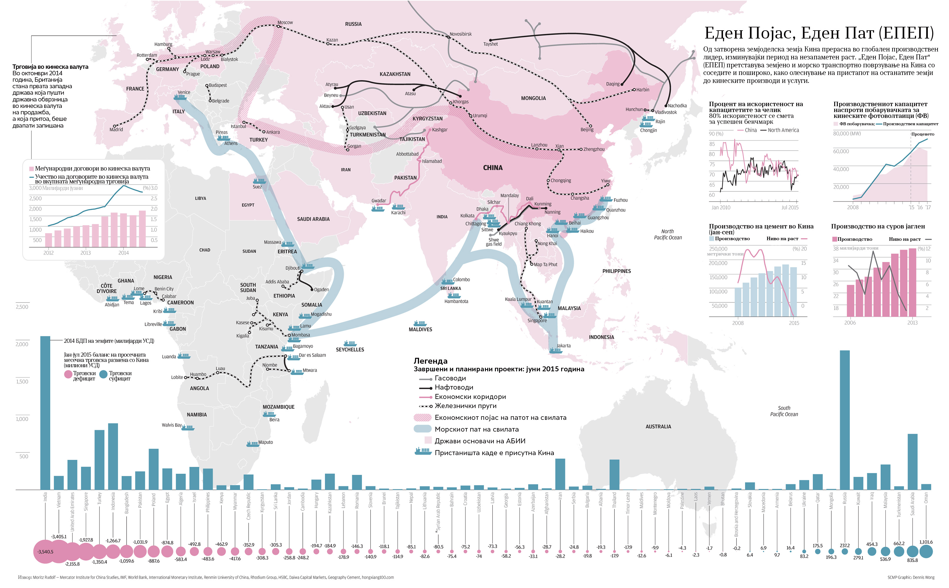Тргнувајќи на 3 јануари од Источна Кина, поминувајќи преку 12 илјади километри низ Казахстан, Русија, Белорусија, Полска, Германија, Белгија и Франција, на 18 јануари за прв пат еден товарен воз пристигна директно од Кина до Лондон. Иако повеќе како симболичен подвиг, овој настан испрати силна порака за целта на новиот „Пат на свилата“. Исто како и во антиката, ЕПЕП треба да обезбеди поврзување на Истокот и на Западот во секоја смисла на зборот. Најпрво како олеснување на економската размена и поттик за унапредување на слободната трговија, а натаму и како цивилизациско и културолошко поврзување на Истокот и на Западот. Покрај овој симболичен подвиг, Кина веќе сериозно работи на оформување на европскиот дел од ЕПЕП. Најпрво, пред една година, Кина го купи најголемото грчко пристаниште во Пиреја, Атина, а веќе покажува нескриена намера да го купи и второто по големина пристаниште, Солунското. Пред некое време дури и кај нас стана актуелен железничкиот коридор Север – југ што треба да ги поврзе најпрво Букурешт со Белград (договорот за соработка се потпиша пред околу шест месеци), а потоа Белград преку Скопје (и/или алтернативно преку Софија) со Солун. Овие рути претставуваат продолжеток, хаб на новиот морски пат на свилата кој, како крајна цел, треба да обезбеди поврзување на пристаништата во Егејското Море со Источна и со Централна Европа. При остварување на оваа соработка Кина ја спроведува својата економска доктрина пошироко од само изведба на транспортните рути: кинеските компании веќе ги купија најголемите железари на Балканот во Смедерево; кинеските енергетски компании веќе управуваат со најголемите термоелектрани во Унгарија; кинески конзорциуми обезбедија кредити и изведба на најголемите инфраструктурни проекти во Македонија; дел и од нашите железари беа и веројатно сѐ уште се предмет на кинески интерес итн. Всушност, иако сѐ уште неагресивно, трпеливо и внимателно, кинеското присуство во Источна Европа се спроведува веќе подолго време.
