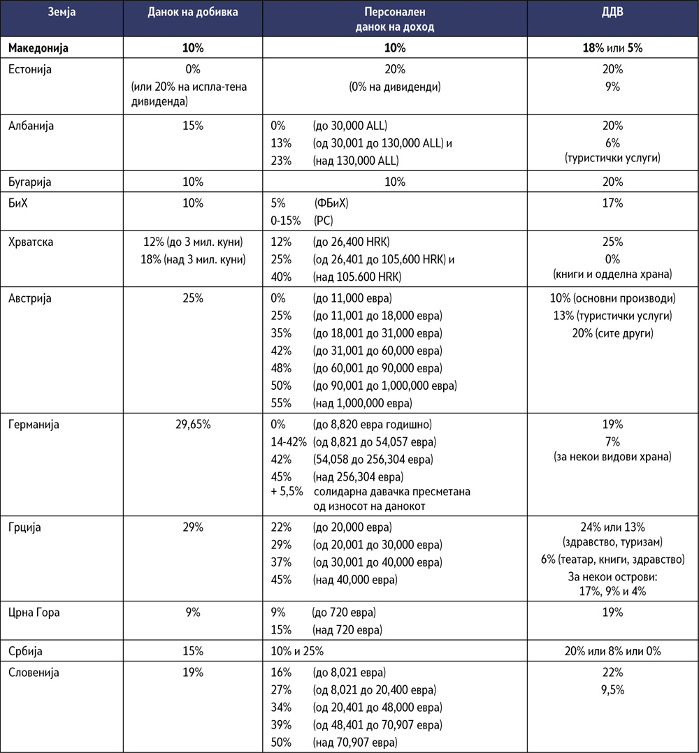 Преглед за висината на даночните стапки на данокот на добивка, персоналниот данок и ДДВ по одделни земји