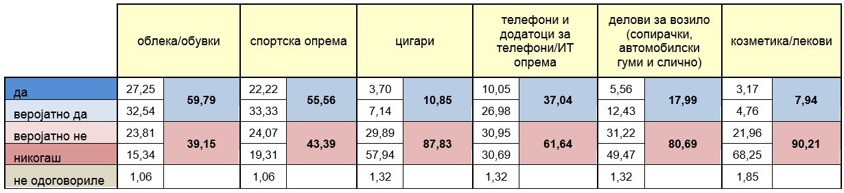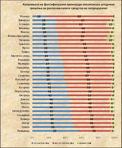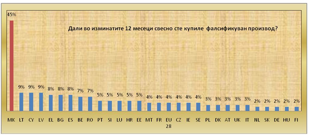 Високи 45 % од испитаниците во изминатите 12 месеци свесно купиле фалсификуван производ, единаесетпати над европскиот просек, а далеку и над најлошиот резултат во државите во Европската Унија (9 % во Литванија, Кипар и Летонија, 8 % во Грција, Бугарија и Шпанија). Сомнежот дека потрошувачите во Европската Унија не биле целосно искрени во одговарањето на прашалникот е доказ и дека во Република Македонија постои широко распростанета општествена прифатливост од купувањето фалсификувани производи. Стравот од јавна осуда е минимален. И бројот на набавки како резултат на заблуда е петпати над просекот во Унијата. Сепак доминира свесното купување фалсификувани производи.
