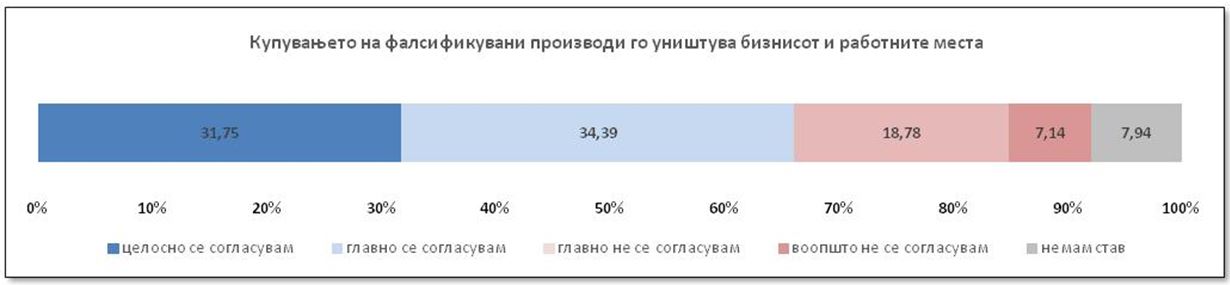 Просечниот потрошувач е свесен за штетните последици кои купувањето фалсификувани производи го има во однос на бизнисот и намалувањето на работните места. Ни семејните приходи, ни возраста играат каква било улога во ставот.