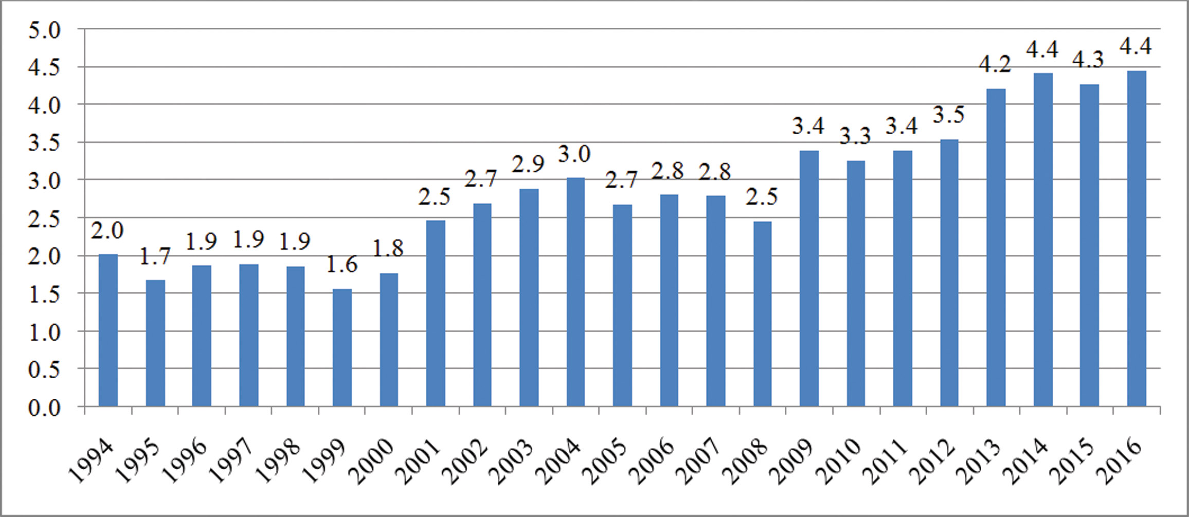 Графикон бр. 2. Годишен трансфер од Централниот буџет на РМ до Фондот за ПИОМ 1994 – 2016 година (проценти од БДП)