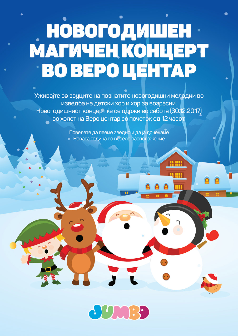 Предновогодишната атмосфера во Веро Центар ќе ја загрее детски хор на кој ќе му се придружи хор од возрасни музичари, при што дел од изведувачите ќе се појават од различни страни на трговскиот центар. Нивниот настап ќе биде придружуван од професионален гудачки оркестар. Сите музичари заедно ќе изведуваат популарни новогодишни композиции кои совршено ќе се вклопат во празничниот амбиент кој изминатиов период владее во Веро Центар. Посетителите на Центарот ќе може да се одморат од празничниот шопинг уживајќи во волшебните звуци на класичната и празничната музика, а во исто време и да поминат забавно време со своите најблиски.