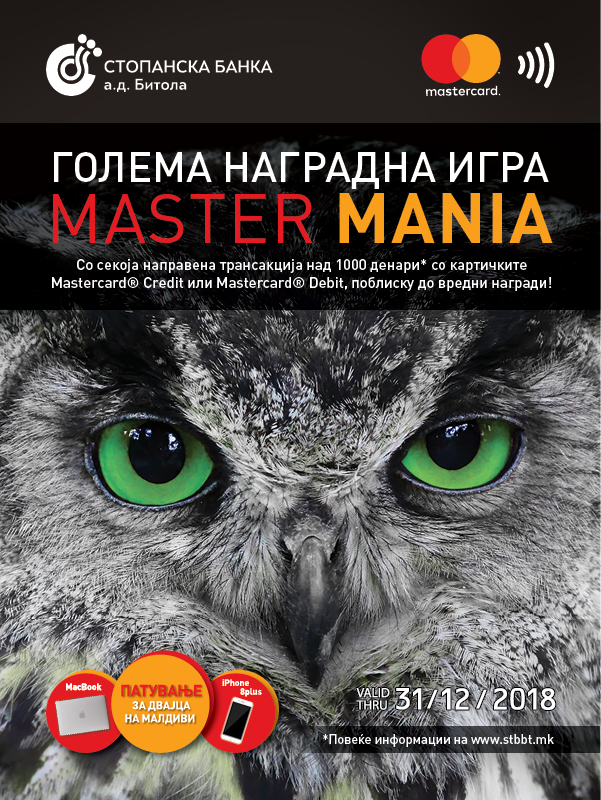 Патување за двајца на Малдивите, MacBook и iPhone 8plus се главните награди на наградната игра „STBBT MASTER MANIA“ што ја организираат Стопанска Банка а.д. Битола и Mastercard. Наградната игра ќе трае до 31 декември годинава, а во неа може да учествуваат сите постоечки, како и новите корисници на Mastercard Credit и Mastercard Debit од Стопанка Банка а.д. Битола, кои ќе извадат вакви картички до крајот на годината.