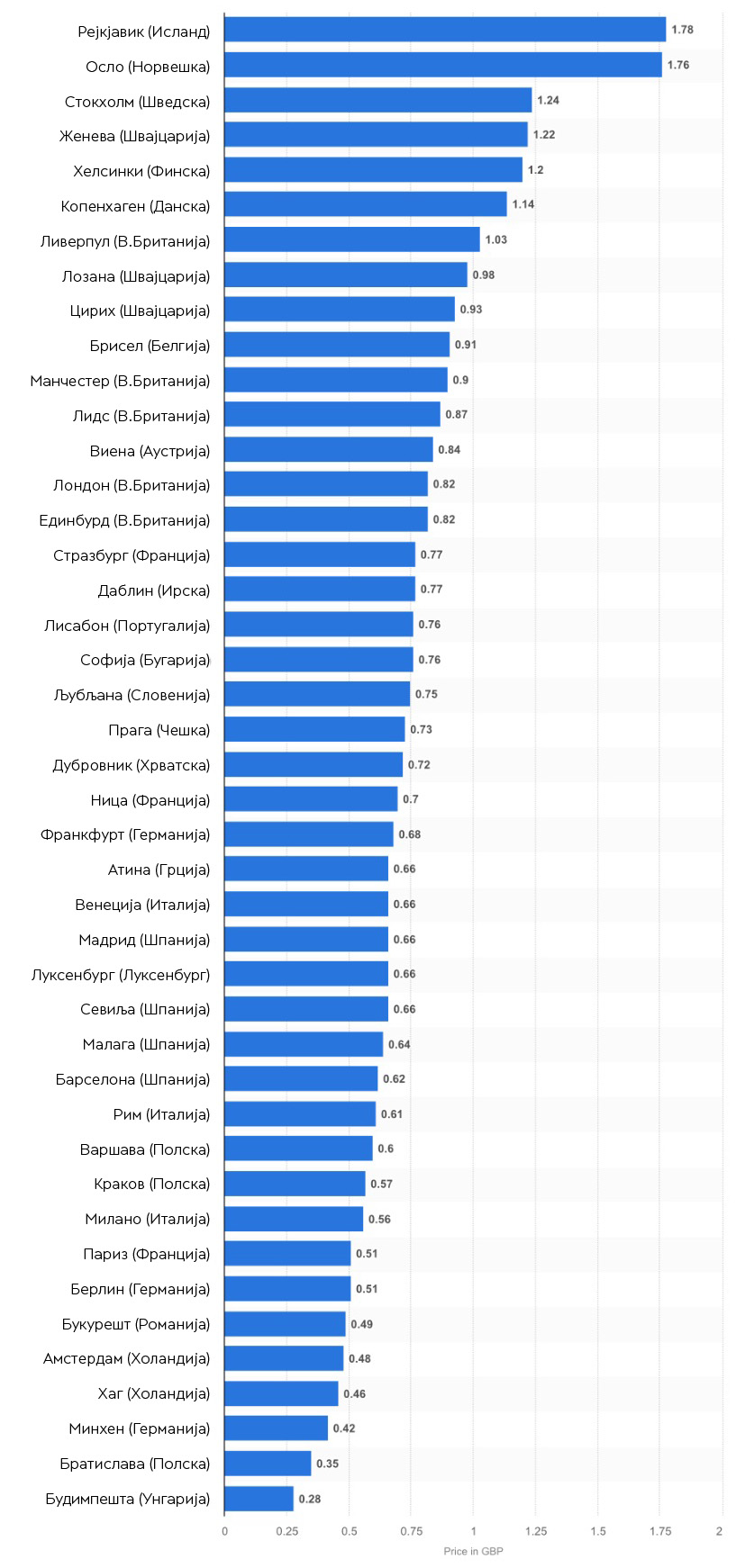 Просечна цена на шише пиво од 0,33 литри во супермаркети во ЕУ во 2016 година, по градови (во британски фунти)