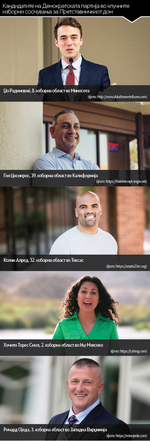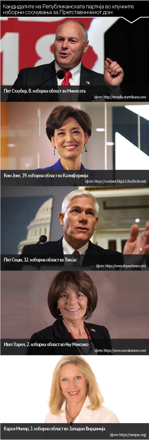 Од повеќето изборни трки ќе издвоиме неколку за кои сметаме дека ќе ја претставуваат целата слика за претстојните избори. Таква е Осмата изборна област во Минесота, која традиционално во Претставничкиот дом ја претставува кандидатот на демократите, Рик Нолан. Нолан доаѓа од демократскиот приврзок, т. н. „Демократска фармерско-работничка партија“, и кој веќе со децении го повторува овој успех. Овојпат Рик Нолан го напушта ова место и демократите „ќе трчаат“ со нов кандидат, неговиот соработник Џо Радиновиќ. На претседателските изборите 2016 година, Осмата изборна област во Минесота беше една од оние со кои изненади успехот на Трамп, што ја прави оваа единица најдобар репрезент за обидот на демократите да ги задржат местата во оние пет - шест изборни единици кои се сметаат за ризични. Такви се и Првата изборна област во Минесота, но и Третата во Невада, додека онаа 14. во Пенсилванија, поради наводен неуставен изборен „геримандеринг“, е соодветно прекроена и речиси сигурно оди во рацете на републиканците.