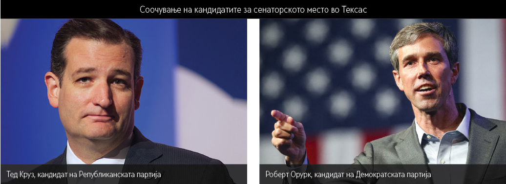 А промената во расположението за избор на сенатори почна да се чувствува и во традиционално „црвениот“ Тексас. Тоа е држава во која демократите не успеале да освојат сенатско место повеќе од 25 години, која републиканците ја сметаат за свое најсилно упориште и каде што овојпат сегашниот сенатор и силен републикански авторитет Тед Круз е во трка да го задржи своето место. Но, и покрај сите овие позитивни предиспозиции, трката за сенаторското место во Тексас станува сè повеќе непредвидлива при што се запалија сите црвени светла за предупредување во рамките на Републиканската партија и се вклучија сите механизми за заштита на оваа позиција. Анкетите сè уште покажуваат предност на Круз пред демократскиот кандидат Роберт Орурк, но предноста е едноцифрена, што покажува дека расположението во Тексас не е веќе толку „црвено“ и дека републиканците не можат да ја прокнижат оваа победа без автентична борба.