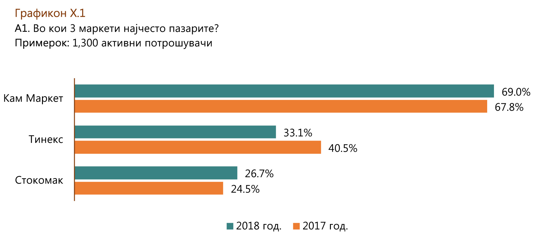 Според спроведеното истражување и оваа година на првата позиција е Кам Маркет со значајно повисоко учество од сите останати ланци на маркети и приближно еднакво учество како и во претходната 2017-та година. Тинекс е на втора позиција повторно како и претходната година, но со пониско учество во одговорите, и Стокомак кој го заменува Веро на третата позиција.
