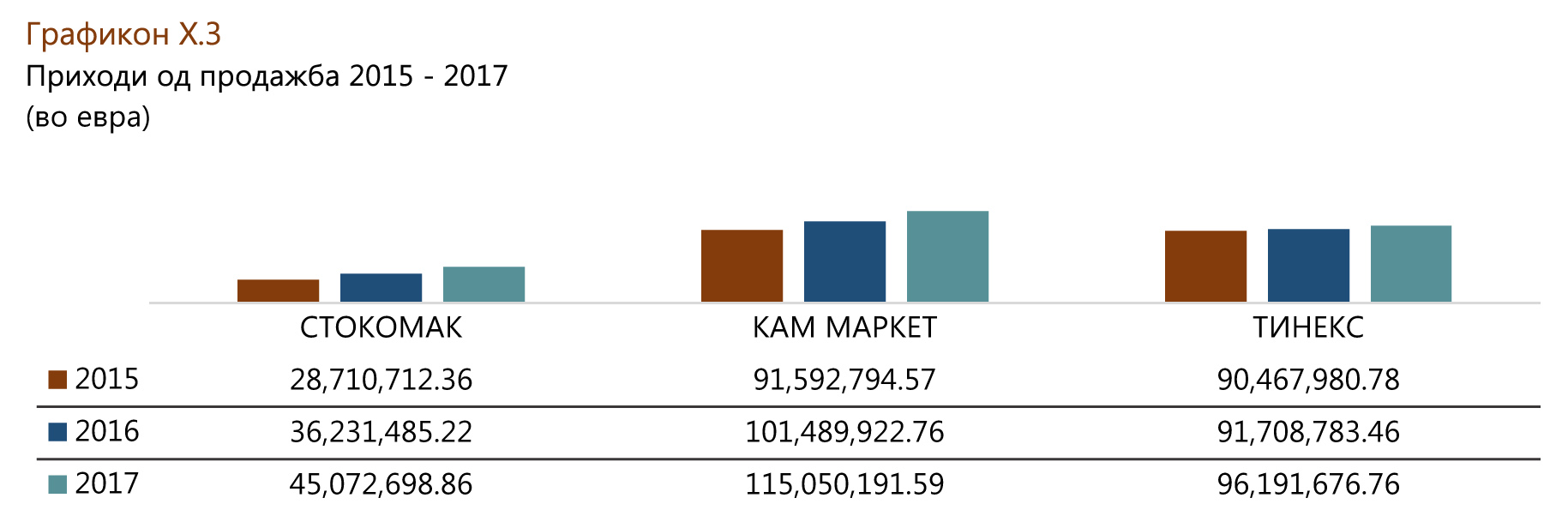Од финансиски аспект, најзначајно апсолутно зголемување во приходот од продажба има во Кам Маркет каде од 91 мил. се искачува на 115 милиони или раст од 24 мил. евра за период од 3 години. Потоа, следи Стокомак со раст од приближно 17 милиони евра и 6 милиони евра во Тинекс.