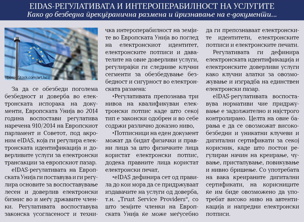 Следејќи ги европските искуства и стандарди во оваа област и во нашава држава се поставуваат основите за безбедна дигитална трансформација. Во подготовка е закон со кој се регулира работењето и управувањето со електронски документи и електронски потпис и печат во Република Македонија во согласност со eIDAS-регулативата на Европската Унија.