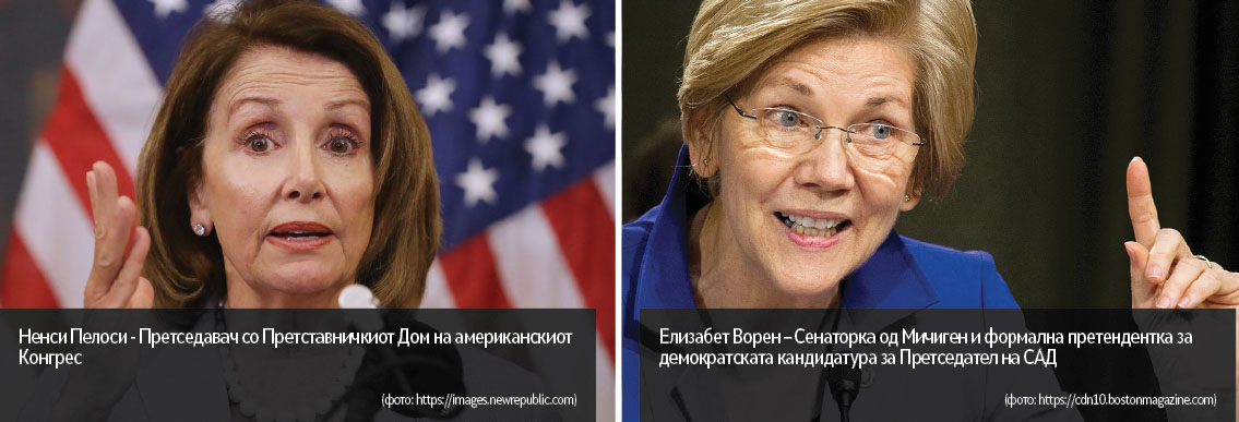 А како нивна предводничка, и веројатно периодов најголемата ноќна мора на Доналд Трамп е староновата претседавачка со Претставничкиот дом, Ненси Пелоси, која доаѓа од Калифорнија. Додека го пишувам овој текст, а веројатно и во моментот додека вие го читате, сѐ уште на сила е т.н. „Гасење на Владата“ (Government shutdown), лимитирано финансирање на американската администрација како форма на притисок на претседателот Трамп за политички отстапки од страна на Претставничкиот дом за неговите бесмислени барања за изградба на „ѕидот“. Лажната мажественост на Трамп, изразена преку пренагласениот мачоизам, буквално се распаѓа пред елегантната цврстина на Ненси Пелоси изразена преку грациозната стаменост на нејзиниот политички габарит. Трамп толку е беспомошен пред непоколебливоста на Пелоси што, покрај умерените конзервативни гласачи од десниот центар, почнуваат да се тресат основите и во длабоката десница од каде што Трамп најмногу ја влече својата политичка стабилност. „Гасењето на Владата“ веќе станува неподносливо за политичките елити, а искуството на Пелоси не дозволува гласачите секој ден да не бидат потсетувани чие масло е оваа авантура. Разликата во одобрувачкиот рејтинг на Трамп се намали од -10 процентни поени (во корист на против) на -15 процентни поени со што негативниот имиџ доби 50 % зголемување. А и самата оваа авантура (со „Гасењето на Владата“) веројатно претставува очаен обид за да се добие маневарски простор за она што неминовно следува по освојувањето на Претставничкиот дом од страна на демократите, а тоа е покренување на сите досегашни иницијативи за транспарентност, истраги итн., кои Трамп вешто ги избегнуваше контролирајќи ги сите три власти на федерално ниво: претседателската функција, Сенатот и Претставничкиот дом. Знаејќи ја жестината на Пелоси, зад чија палка застанува мнозинството во Претставничкиот дом, и на самиот Трамп му е јасно дека следува: објавување на резултатите од сите досегашни истраги врзани за неговата претседателска кампања и евентуалната соработка со Русија; потоа со сигурност ќе следува објавување на неговите даночни пријави кои, иако се сигурно легални, но далеку од морални, а и вистински ќе ја извадат на виделина неговата „дил ориентираност“; натаму следуваат извештаите, сведочењата од специјалниот обвинител; разни анкетни комисии за истражување кои, во САД за разлика од кај нас, имаат навистина силен импакт во американското општество итн. Сѐ на сѐ, веќе е јасно дека во периодот што следува Пелоси ќе претставува една од клучните точки со која демократите ќе ја поткопуваат позицијата на Трамп.