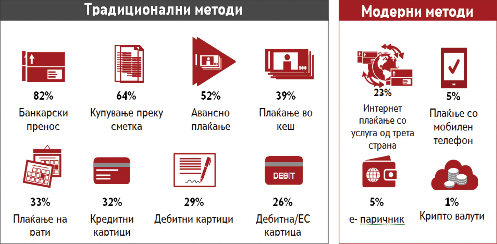 Конвенционалните начини на плаќање кои најчесто се користат се банкарските трансфери (82%) и купувањата на сметка (64%) што многу се користат во Западна Европа (73%), но многу помалку во Источна Европа (59%) - иако е најзастапениот начин на плаќање во Полска (90%). Повеќе од една третина од европските компании (39%) сè уште нудат можност за плаќање во готово, при што овој процент е повисок во балканскиот регион (41% во Бугарија и 48% во Хрватска).