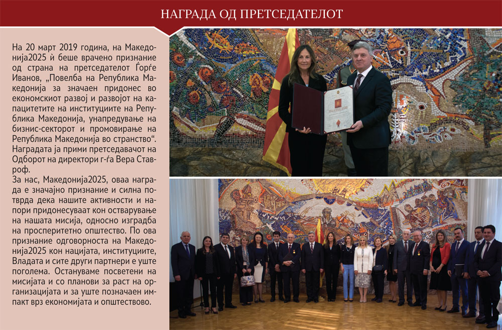 Мошне важно за поврзувањето на Македонија2025 со мене (и обратно) е тоа што делиме исти цели и иста мисија. Мојот извор на мотивација и на инспирација е токму подобрување на животот на граѓаните, и во економска смисла, но и во смисла на квалитет на живот. Токму поради тоа сметам дека сум привилегирана што ќе ја извршувам оваа важна функција и што ќе продолжам да го надградувам она што досега е сработено. Имам огромна поддршка од Одборот, прекрасни луѓе, големи професионалци, успешни луѓе на кои сум им мошне благодарна што одвојуваат време, енергија и финансиски средства за поддршка на нашава земја.