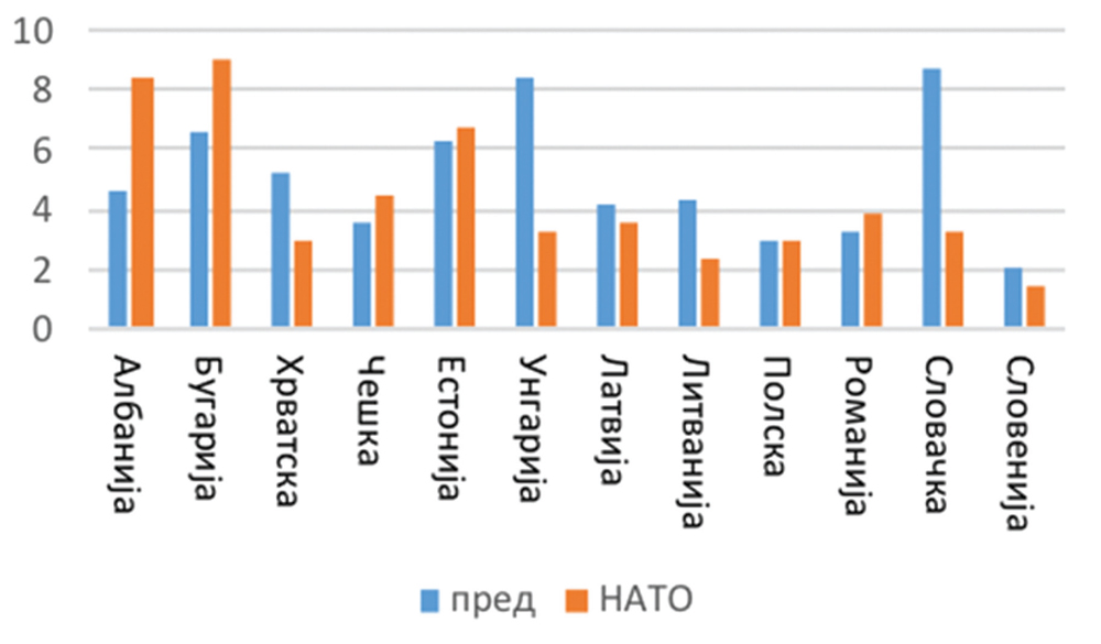 Како илустрација на тезата дека членството во НАТО само по себе нема врска со СДИ, т. е. дека приливите на СДИ претежно зависат од други фактори можат да послужат двете слики дадени во продолжение. Првата слика ги покажува СДИ во новите членки на НАТО, набљудувани во два периода: пред и по влезот во НАТО. Притоа вториот период ги опфаќа годините од влезот на соодветната земја во НАТО (1999 г. за Полска, за Унгарија и за Чешка, 2009 г. за Хрватска и за Албанија и 2004 г. за останатите) заклучно до 2017 година. Должината на првиот период е различна за различни земји и зависи од расположливоста на податоците.