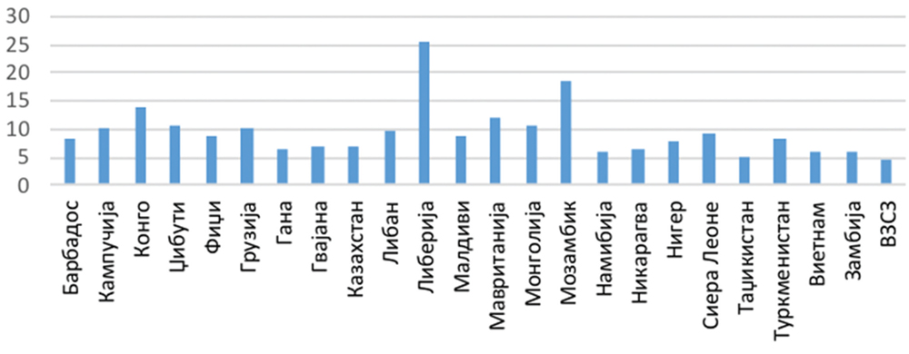 Најпосле, сликата број 2 покажува колку е бесмислена тезата дека НАТО носи повеќе странски инвестиции. Таа ги покажува СДИ во избрани земји (претежно од Африка и од Азија) во периодот 2004 – 2017 г. (за да биде споредлив со периодот на зачленувањето на новите земји во НАТО). Сликата ги покажува инвестициите во избрани земји токму за да покажам дека секогаш можете да си најдете поединечни примери (па, дури и повеќе примери) кои одговараат на она што сакате да го „докажете“. Конкретно, горната слика покажува дека постојат многу земји во светот кои се сиромашни, кои немаат ниту инфраструктура, ниту човечки капитал, ниту политичка стабилност, ниту силни инвестиции и најпосле, земји кои не се членки на НАТО, ама имаат поголеми СДИ од членките на НАТО. На пример, просечните СДИ во периодот 2004 – 2017 г. изнесувале: 14 % во Конго, 25 % во Либерија, 18 % во Мозамбик, 12 % во Мавританија и 10,5 % во Монголија, а во истиот период новите членки на НАТО имале СДИ во износ од 4,4 %! Патем, има и други земји кои не се членки на НАТО, а имаат поголеми СДИ: таков е примерот на Малта која во периодот 2004 –2017 г. имала СДИ во износ од неверојатни 165 %! Што значи тоа? Дека е подобро ако земјата не е членка на НАТО? Колку е проста ваквата логика покажува последниот столб во сликата: кратенката ВЗСЗ значи визокозадолжени сиромашни земји, а тоа се најзадолжените и најсиромашните земји во светот, со други зборови, најголемите гревови на планетава. Замислете, во периодот 2004 – 2017 г., тие земји имале СДИ од 4,4 %, потполно исто како новите членки на НАТО! Дали од ова треба да заклучиме дека е добро да се биде високозадолжена и сиромашна земја зашто така ќе имаме големи странски инвестиции? Чувај нè Господе од таквата логика!