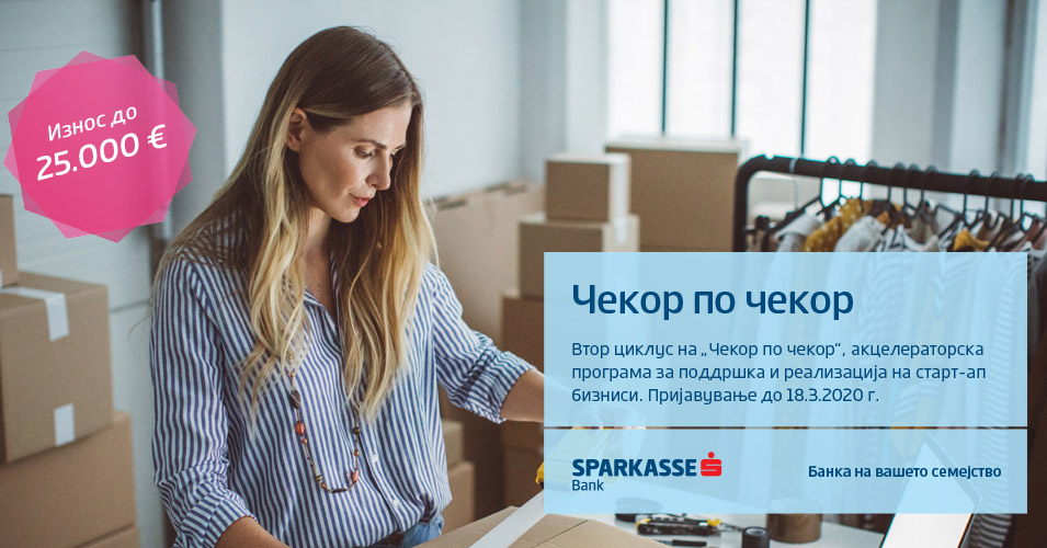 Шпаркасе Банка Македонија втора година по ред ќе го поддржи развојот на младите амбициозни претприемачи со идеја за создавање сопствен бизнис, кои имаат потреба од финансиска помош за понатамошен развој. „Чекор по чекор“ е првата акцелераторска програма од овој вид, која има за цел да обезбеди парична и општествена поддршка на компаниите што се во почетната фаза на отпочнување сопствен бизнис, со можност за кредитирање во износ до 25.000 евра и понуда на пакети за образовна, финансиска и менторска поддршка.