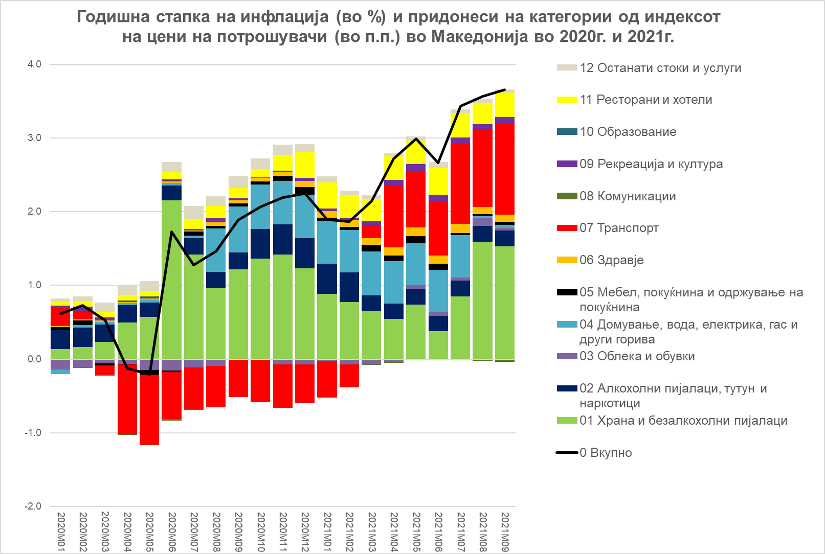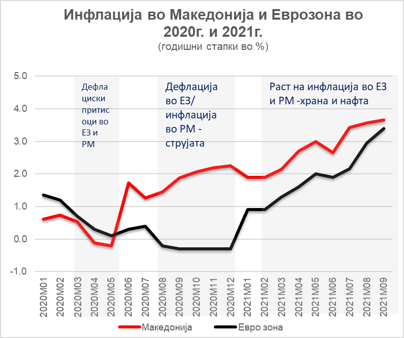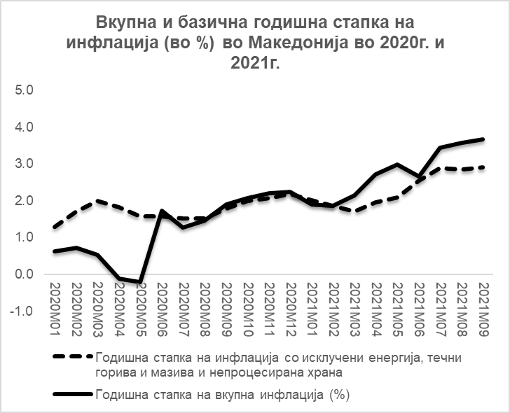 Кај нас, годишната стапка на инфлација во септември достигна 3,7 %, додека просечната годишна стапка на инфлација за првите девет месеци од годината изнесува 2,8 %. Највисок придонес за просечниот годишен раст на инфлацијата имаат трошоците за храна кои објаснуваат околу една третина од инфлацијата (најмногу поради растот на цените на маслото и на зеленчукот), потоа трошоците за транспорт кои објаснуваат околу 20 % од инфлацијата, а се зголемени поради растот на цената на течните горива (на нафтата на светските берзи), потоа трошоците за домување кои објаснуваат 16 % од инфлацијата, а се зголемени поради растот на цената на електричната енергија од август минатата година, потоа трошоците за ресторани и хотели кои објаснуваат 12 % од инфлацијата, а се зголемени поради растот на цените на услугите за сместување. Раст има и кај трошоците за цигари (поради раст на акцизата) и на трошоците за здравствени производи и услуги, последниве веројатно со поголем пондер кој не е опфатен во индексот, а е детерминиран од самата здравствена криза.