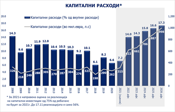 * Реализацијата на Буџетот за 2021 година не е завршена. Бројките се базираат на ребалансот на Буџетот за 2021 година. Можно е потфрлање на трошоците за стоки и услуги и на капиталните расходи, а со тоа и на вкупните расходи.