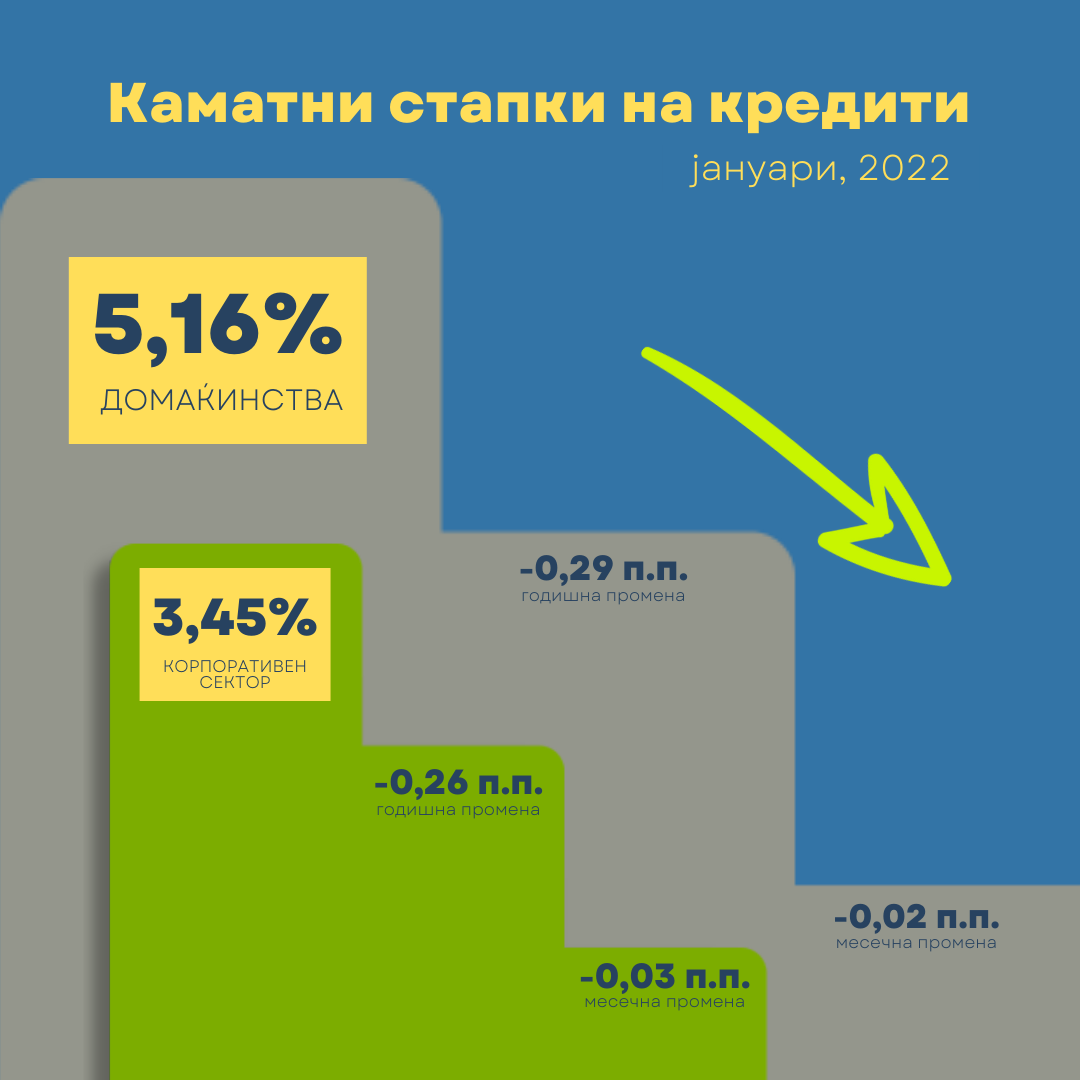 Трендот на намалување на просечната каматна стапка на вкупните кредити продолжи и во јануари 2022 година. Таа се сведе на ниво од 4,35%.