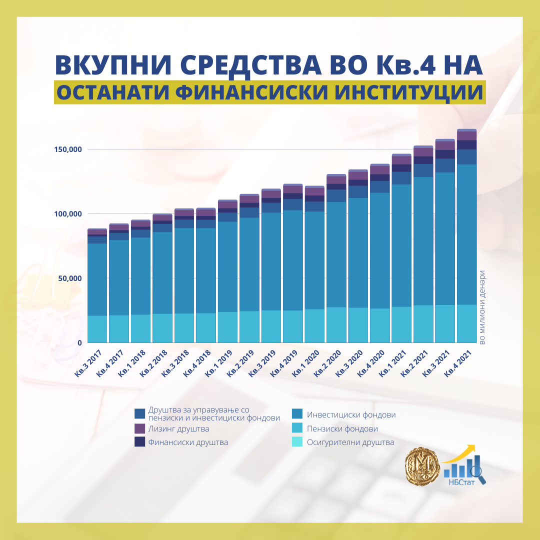 Во четвртиот квартал на 2021 година, вкупните средства на останатите финансиски институции, достигнаа ниво од 165.579 милиони денари и се зголемија за 7.762 милиони денари на квартално ниво. Структурата на средствата, укажува дека доминантно учество од 65,6% имаат пензиските фондови, а по нив следуваат осигурителните друштва, со учество од 17,7%.