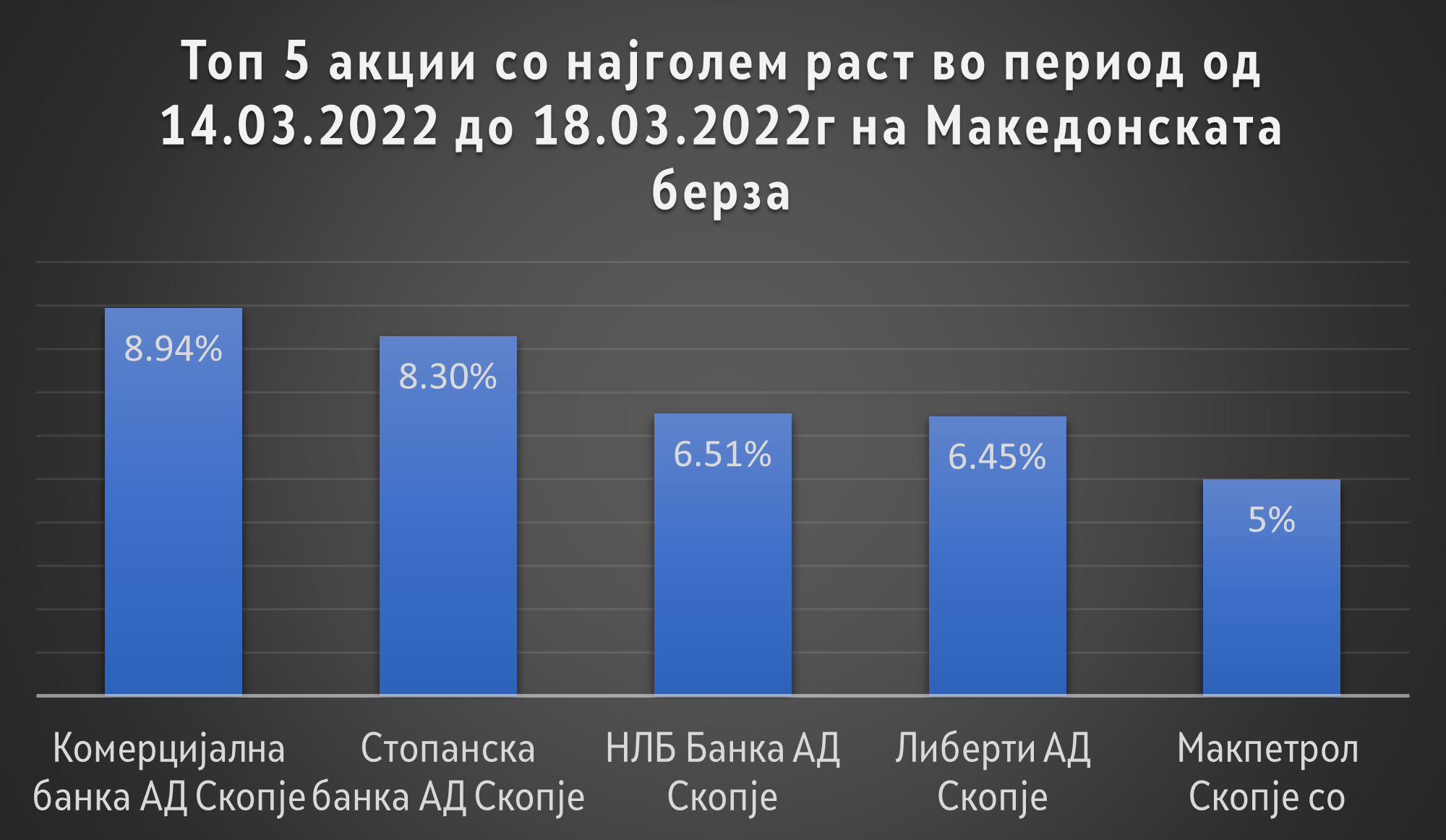 Минатата недела, во периодот од 14.03.2022 до 18.03.2022 година на Македонската берза на хартии од вредност (на официјален + редовен пазар) беше остварен вкупен промет од 72,1 милиони денари или околу 1,17 милиони евра. Овој промет беше реализиран преку 296 трансакции од кои 295 беа на официјалниот пазар и само една трансакција беше остварена на редовниот пазар.
