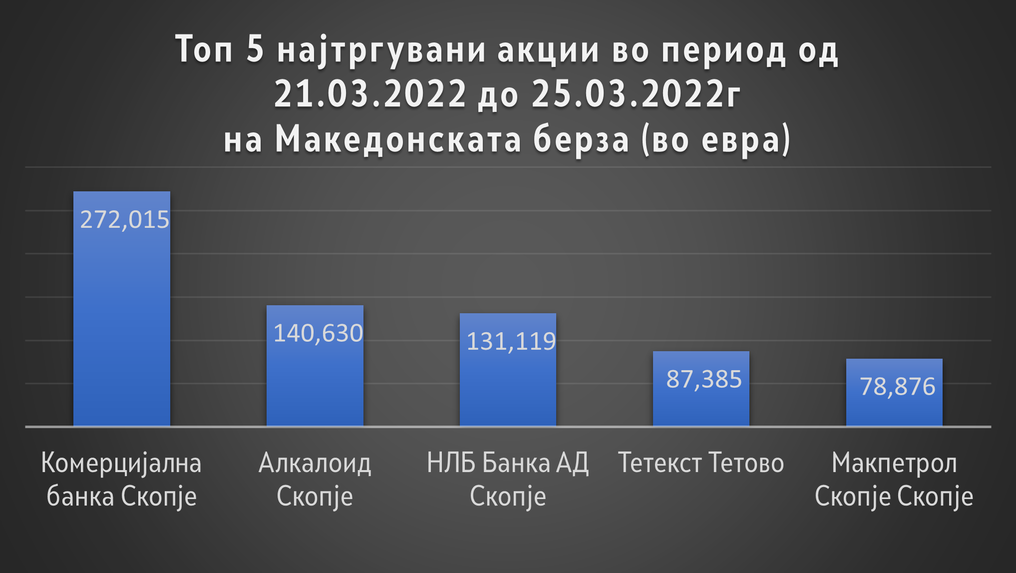 Според вредноста на остварениот промет, минатата недела, во периодот од 21.03.2022 до 25.03.2022 година, на Македонската берза на хартии од вредност најтргувани беа акциите на Комерцијална банка АД Скопје. Со нивното тргување беше остварен промет од 16,7 милиони денари или околу 272 илјади евра (23,4 % од вкупниот промет). Втори најтргувани акции измината недела беа акциите на Алкалоид со вкупен промет од 8,6 милиони денари или околу 140,6 илјади евра (12,1 % од вкупниот промет). Потоа следуваа акциите на НЛБ Банка АД Скопје со 8 милиони денари или околу 131,1 илјади евра (11,3 % од вкупниот промет). Во топ 5 акции според прометот изминатата недела беа уште и акции на Тетекс Тетово со 5,3 милиони денари или околу 87,3 илјади евра и акциите на Макпетрол Скопје со промет од 4,8 милиони денари или 78,8 илјади евра.