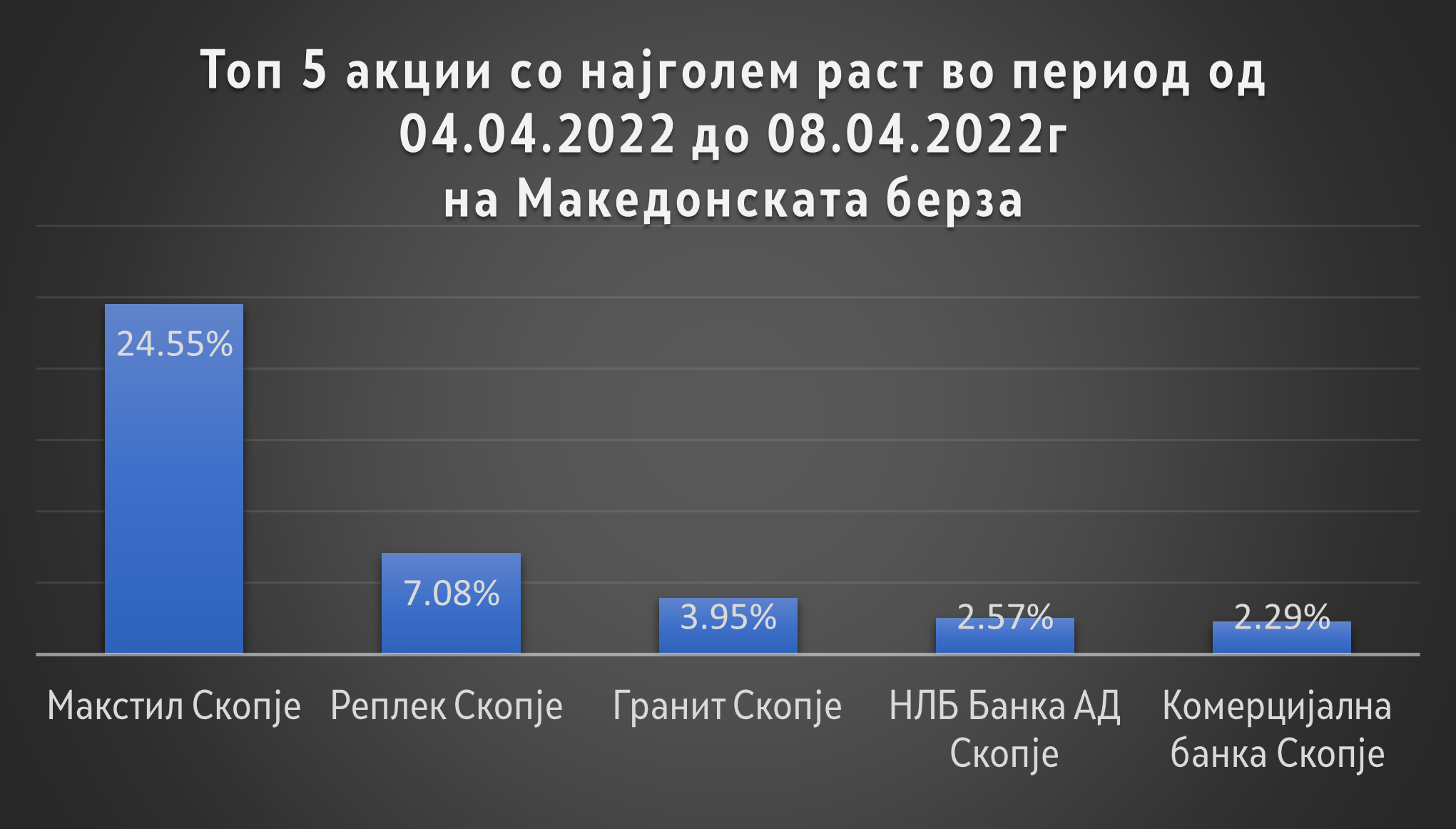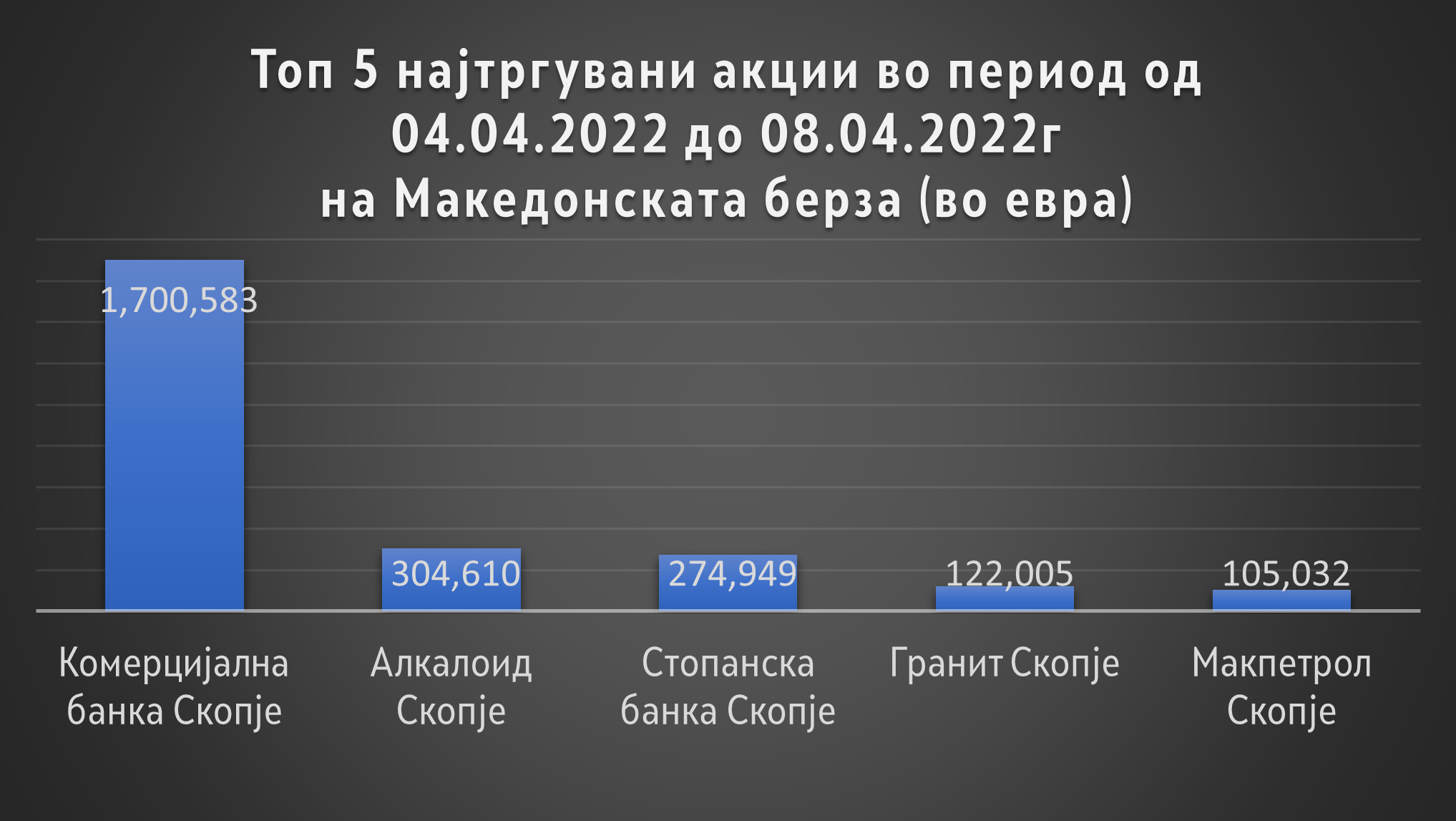 Според вредноста на остварениот промет, минатата недела, во периодот од 04.04.2022 до 08.04.2022 година, на Македонската берза на хартии од вредност најтргувани беа акциите на Комерцијална банка АД Скопје. Со нивното тргување беше остварен промет од 104,5 милиони денари или околу 1,7 милиони евра (61,8 % од вкупниот промет). Втори најтргувани акции измината недела беа акциите на Алкалоид со вкупен промет од 18,7 милиони денари или околу 304,6 илјади евра (11 % од вкупниот промет). Потоа следуваа акциите на Стопанска банка Скопје Скопје со 16,9 милиони денари или околу 274,9 илјади евра (10,1 % од вкупниот промет). Во топ 5 акции според прометот изминатата недела беа уште и акции на Гранит Скопје со 7,5 милиони денари или околу 122 илјади евра и акциите на Макпетрол Скопје со промет од 6,4 милиони денари или околу 105 илјади евра.
