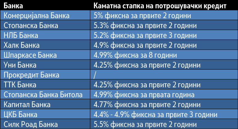 Од погоре прикажана табела, во која се пресликани индикативните понуди на банките за потрошувачките кредити, може да се забележи дека има високо ниво на усогласеност, во пошироки рамки, и дека финеси одлучуваат при креирањето на висината на каматите. Дали тоа ќе биде доволно да се привлечат клиентите и како одредени банки ќе ги вметнат новите проекции во своите производи останува да видиме.