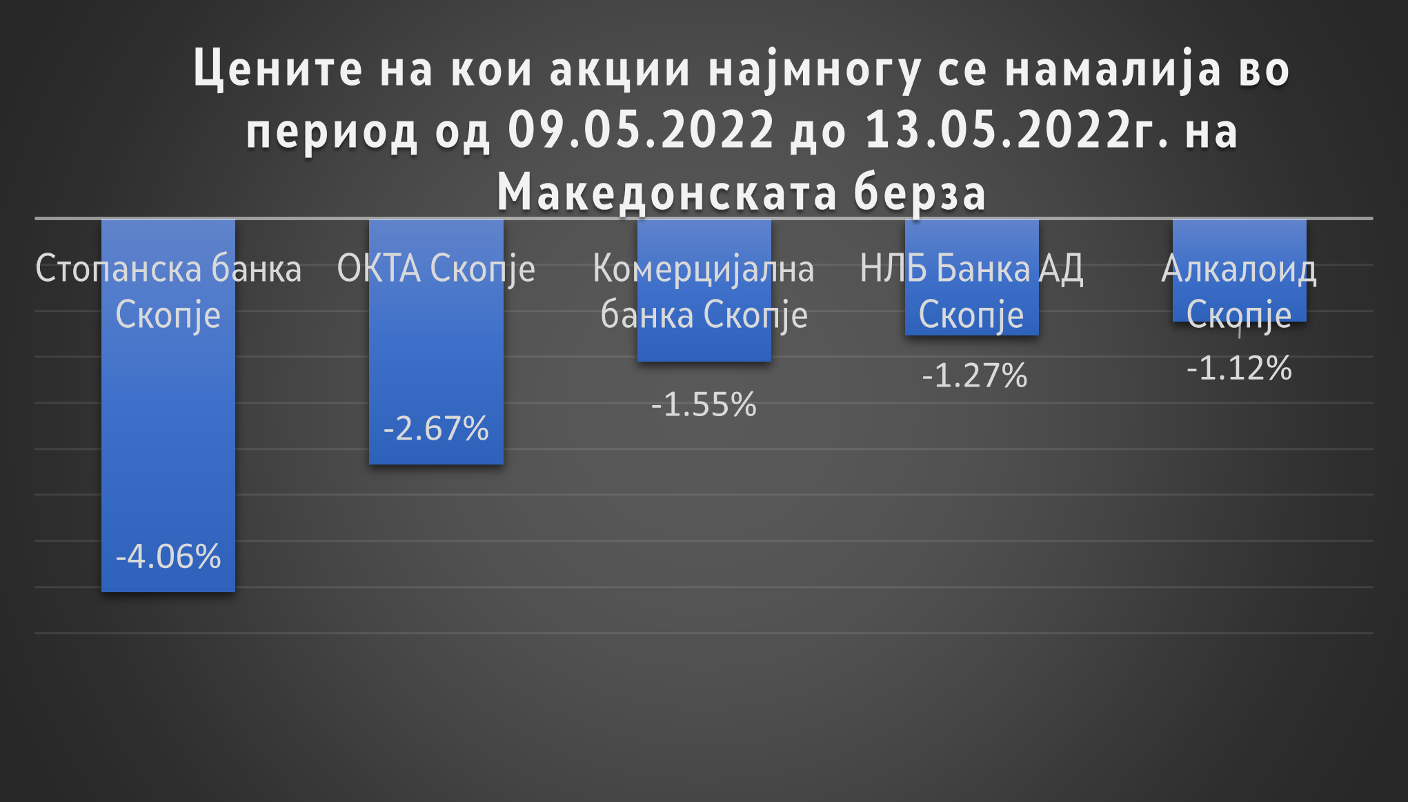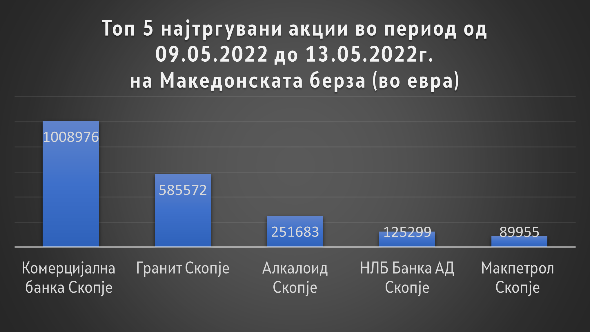 Минатата недела, во периодот од 09.05.2022 до 13.05.2022г. на Македонската берза на хартии од вредност на официјалниот и на редовниот пазар беше остварен вкупен промет од 139,6 милиони денари или околу 2,27 милиони евра. 44,4 % од овој промет (околу 1 милион евра) беше реализиран преку акциите на Комерцијална банка АД Скопје. Втори најтргувани акции беа акциите на Гранит Скопје со 36 милиони денари или околу 585,5 илјади евра (25,7 % од вкупниот промет). Потоа следуваа акциите на Алкалоид Скопје со 15,4 милиони денари или околу 251,6 илјади евра (11% од вкупниот промет). Во топ 5 акции според прометот изминатата недела беа уште и акции на НЛБ Банка АД Скопје со 7,7 милиони денари или околу 125,2 илјади евра и акциите на Макпетрол Скопје со промет од 5,5 милиони денари или 89,9 илјади евра.