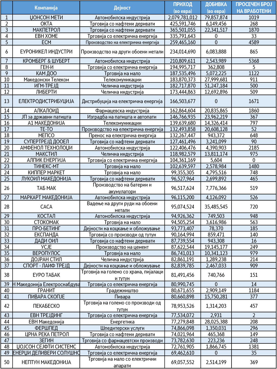 Врз основа на податоците добиени (купени врз основа на договор за соработка) од Централниот регистар на С Македонија, бизнис-магазинот „Економија и бизнис“ направи анализа/рангирање на најголемите 100 компании во нашава земја според остварените приходи во 2021 г. Покрај остварените приходи ќе ги покажеме и вкупните добивки на овие компании, како и колкав е бројот на вработени во нив.