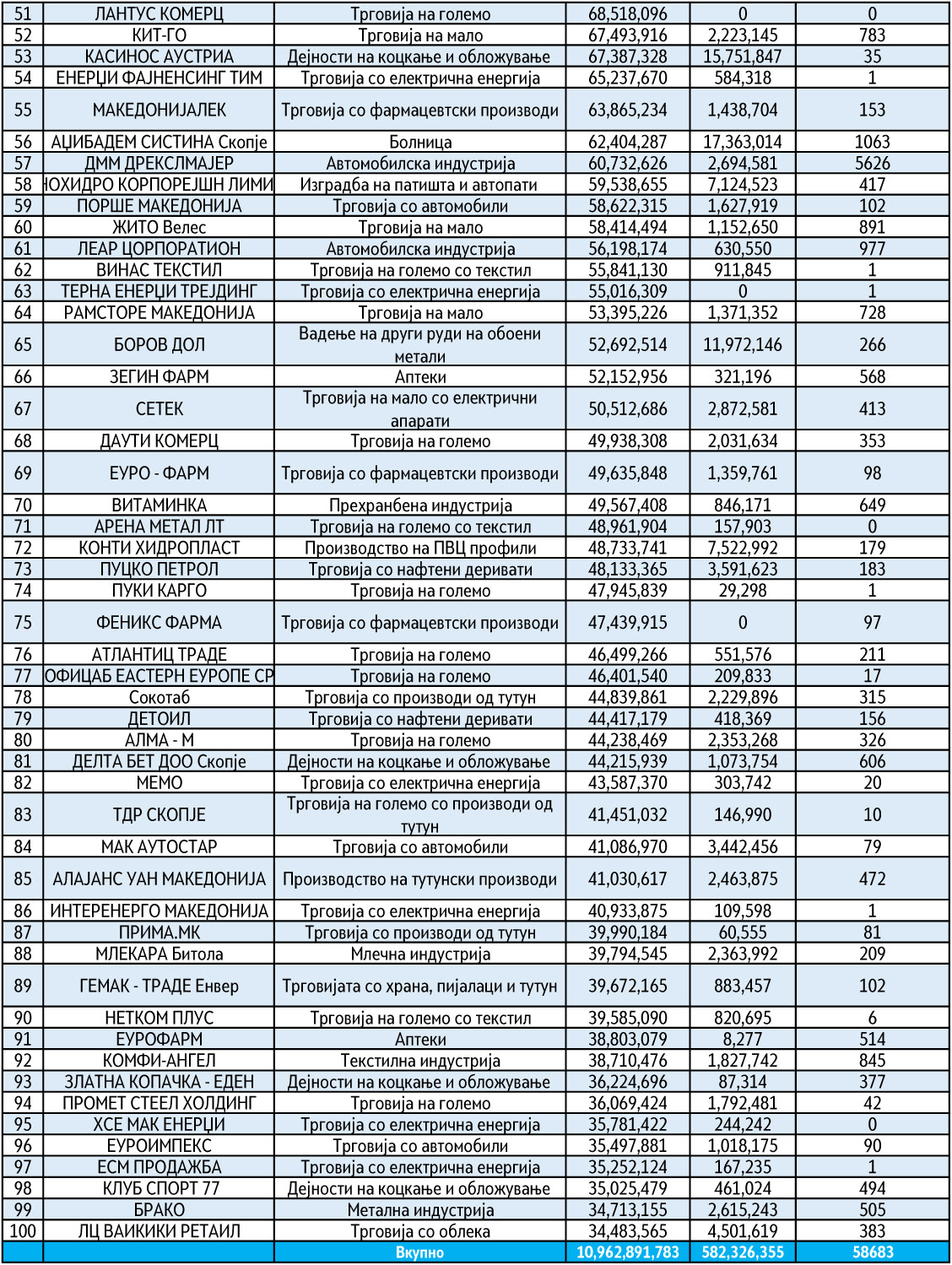 Гледано низ бројки, најголемите 100 компании во Македонија во 2021 година оствариле вкупни приходи од 10,9 милијарди евра. Овие компании лани оствариле вкупна добивка од 582,3 милиони евра. Кога станува збор за бројот на вработени во овие 100 компании лани биле вработени вкупно 58 683 лица.
