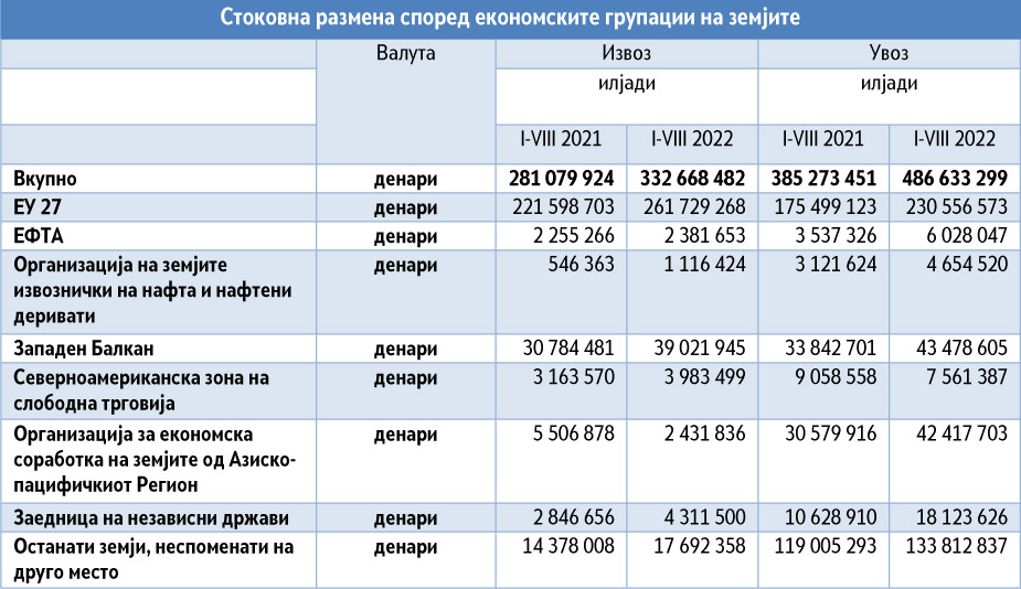 Долната табела ни дава преглед на вкупниот увоз и извоз во првите 8 месеци од 2021 и 2022 година.