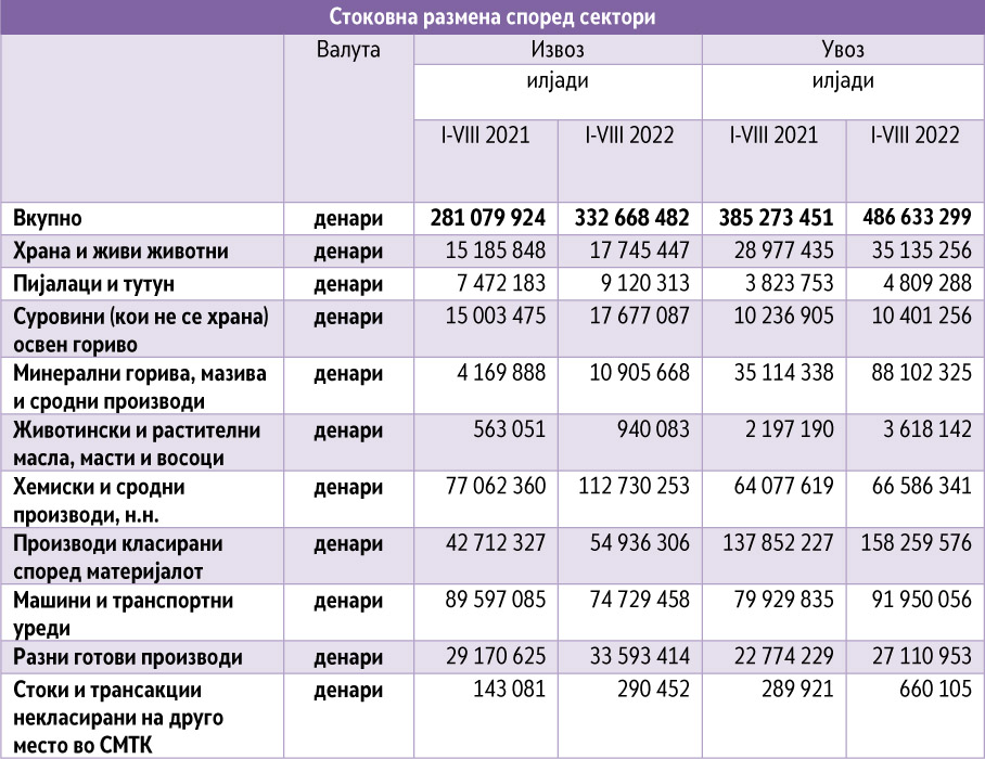 - Генерално земено, во првите 8 месеци од 2021 и 2022 година забележан е вкупен пораст и кај увозната и кај извозната страна. Процентуалните податоци покажувват дека извозот се зголемил за 18.4%, додека увозот со 26.3%. Од табелата евидентно е дека во глобала и двете категории имаат пораст кај сите 10 сектори во 2022 година, со еден исклучок кој се однесува на извозот на машини и транспортни уреди, каде генериран е пад од 16.6%.
