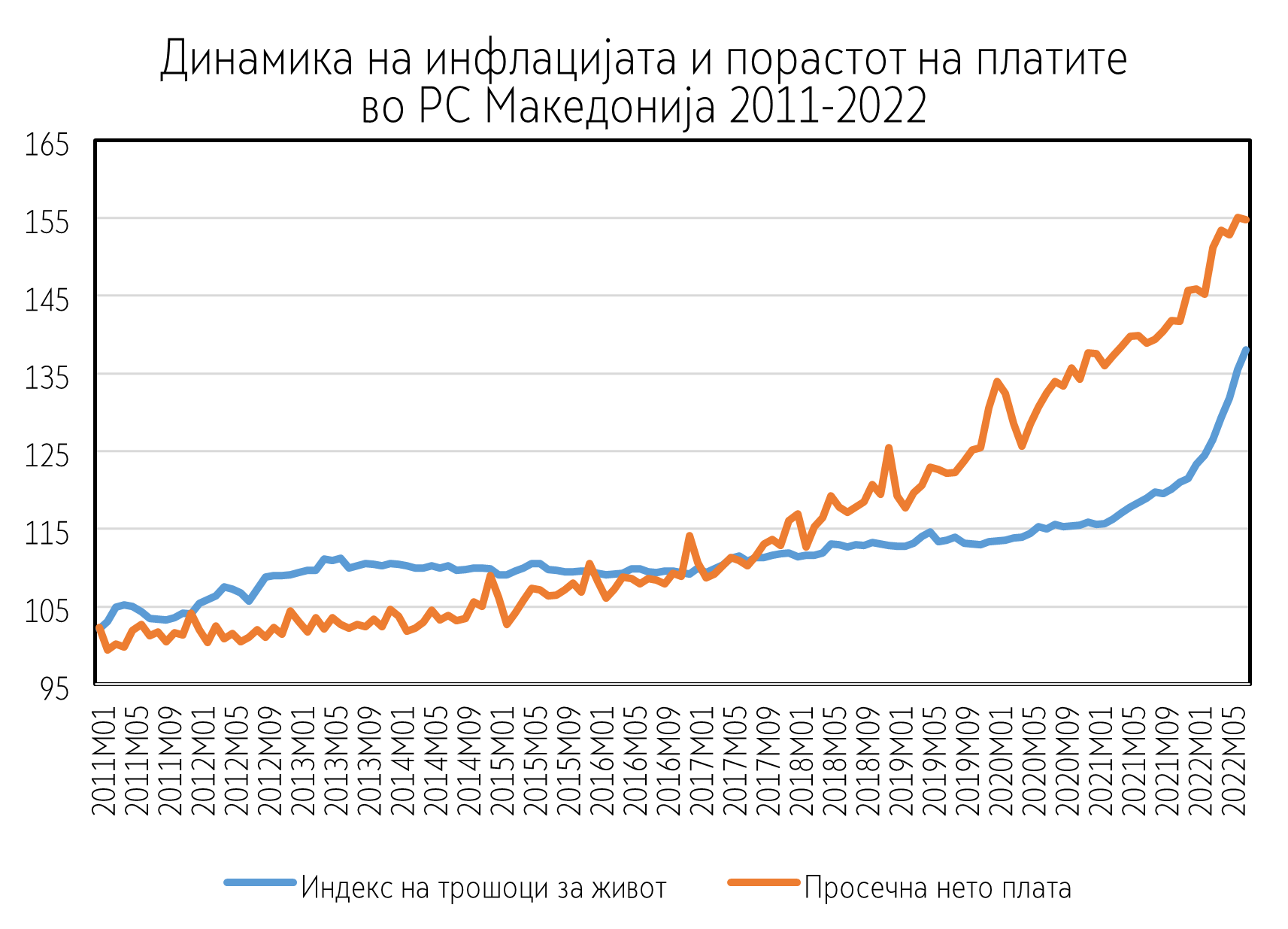 Порастот на инфлацијата од почетокот на 2022 година во РС Македонија во голема мера е придружен со пораст на номиналните плати, што може да се види од графиконот подолу. Така, заклучно со септември оваа година, индексот на трошоци за живот пораснал за речиси 20 проценти во однос на просекот од минатата година. Од друга страна, пак, номиналните плати за истиот период пораснале за нешто повеќе од 10 проценти. Тоа укажува на пад во реалните плати, а со тоа и на куповната моќ на населението. Во услови кога не постојат претпоставки за зголемен пораст на продуктивноста на трудот, очекувано е ваквиот пораст на номиналните плати дополнително да ја подгрее инфлацијата.