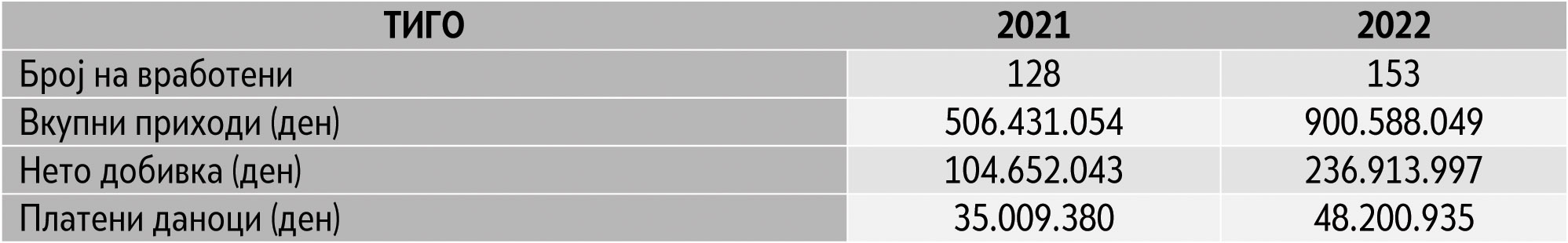 Како компанија, Тиго во изминатите 5 години се позиционираше како сериозен „играч“ со намера да биде двигател на развојот на финтек индустријата во нашата земја. Имено, ја заокруживме 2022 година со зацврстена позиција од аспект на резултати од оперативното работење, клиентското искуство, препознатливост на брендот, како и социо-економското влијание врз домашната економија. За период од 5 години, евидентиравме над 280 илјади одобрени кредити за подобрување на куповната моќ на стотици илјади граѓани, со што не само што обезбедуваме финансиска инклузија на неопслуженото население, туку преку својата работа остваруваме и значаен придонес врз севкупната домашна економија. Обезбедувањето на врвно корисничко искуство преку понуда на услуги кои ги пресретнуваат потребите за финансиски средства, како и преку градење взаемна доверба со клиентите, денес нè прават водечки „Top of mind“ бренд во финтек индустријата, компанија со највисока лојалност од страна на клиентите и најпрепорачан бренд за брзи кредити, според истражувањето на агенцијата Рејтинг.