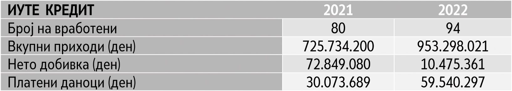 Небанкарските финансиски друштва исто така се соочуваат со предизвиците од нарушената макроекономска стабилност, а исклучок секако не е и ИУТЕ Кредит. Сепак, со една конзервативна (засилена кредитна анализа), но активна финансиска стратегија (воведување иновации) успеваме да оствариме умерен раст на пласманот на нашите услуги во првите два месеци од 2023 година во споредба со истиот период од 2022 година. Имено, во соработка со компанија од Естонија ГЕТ ИД (GET ID) ја воведовме услугата за електронска идентификација на нашите клиенти со што Иуте Кредит има целосно дигитализиран процес на апликација, одобрување и потпишување на кредити. Електронската идентификација ја зголемува безбедноста на клиентите и во најголема мера спречува можна злоупотреба на податоците на клиентите.