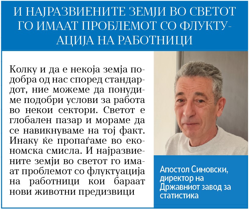 Проблемот со недостиг на работници, според Апостол Симовски, директор на Државниот завод за статистика, не треба да се гледа само од економскиот аспект и помалите плати во Македонија. Одливот на работна сила е поттикнат и од други причини, смета тој.