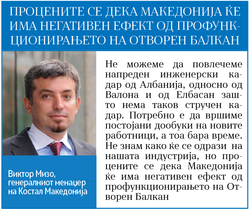 – Сега со Отворен Балкан им се нудат поголеми можности на нашите работници да заминат во соседството. Каде попрво би заминал некој работник од Куманово? Дали ќе одлучи да работи во Охрид и да патува неколку часа или ќе одлучи да работи за повисока плата во некои од компаниите во Ниш или во Нови Сад? Можностите што ги нудат српските компании и тие од Хрватска се многу поповолни. Таму платите во нашата гранка се повисоки за 50 отсто и компаниите од македонската автомобилска индустрија не можат да ги следат. И со сегашните плати сме на максималното ниво зашто за зголемување на платите е потребно да се зголеми и продуктивноста. Едноставно нема од каде да повлечеме работници од регионот. Не можеме да повлечеме напреден инженерски кадар од Албанија, односно од Валона и од Елбасан зашто нема таков стручен кадар. Потребно е да вршиме постојани дообуки на новите работници, а тоа бара време. Не знам како ќе се одрази на нашата индустрија, но процените се дека Македонија ќе има негативен ефект од профункционирањето на Отворен Балкан, ни изјави Виктор Мизо.