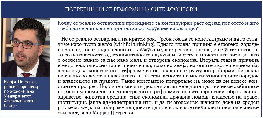 Марјан Петрески, редовен професор по економија на Универзитетот Американ колеџ Скопје, дава неколку аспекти за очекувањата за остварувањето на економскиот раст за годинава.