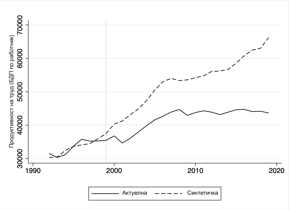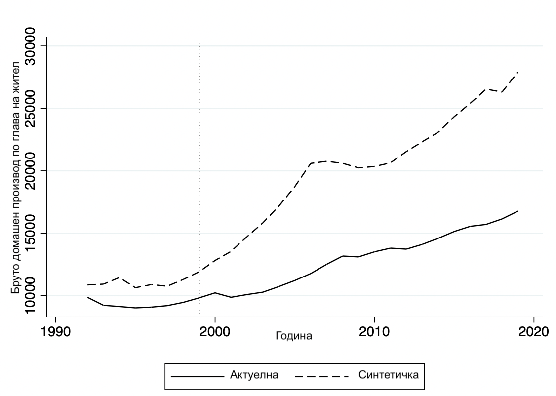 Сигналите кои ги најавува Европската Унија пред интеграцијата странските инвеститори неизбежно ги очекуваат како арбитражна прилика, а посочуваат дека економскиот раст поттикнат од интеграциските канали на една земја настапува пред официјалниот влез во ЕУ. Ова а битен факт бидејќи доколку во процесот на моделирање се одбере погрешна година во која настапува третманот (ефектите од ЕУ-интеграција), независните варијабли нема да определат соодветен фит за синтетичката држава. Со таа цел, одбрана е 2000 година како период во кој настапува третманот врз синтетичката држава. Независните варијабли кои мерат економски промени се исто така внимателно одбрани да не рефлектираат идиосинкратски шокови од интеграцискиот процес; притоа примероци се земени исклучително од држави чија економска големина наликува на македонската. Првиот графикон го претставува диспаритетот меѓу евидентираната/актуелната (actual [полна линија]) и синтетичката (испрекината линија) опсервација во однос на бруто-домашниот производ по глава на жител (Партитет на куповна моќ, константен 2017 $). Вертикалната испрекината линија го преставува периодот во кој третманот (ЕУ-интеграција) настапува врз синтетичката опсервација. Во опсервираниот период може се забележи прогресивно зголемување на растојанието меѓу синтетичката и актуелната опсервација, што потенцира дека придобивките прогресивно се зголемуваат со интеграциската длабочина. Имено, разликата во просечната годишна стапка на раст преку 20 години во однос на БДП по глава на жител меѓу евидентираната и синтетичка Македонија изнесува 7,09 %; во 2019 година, БДП по глава на македонски жител ќе достигнеше вредност повисока за 61,4 %.